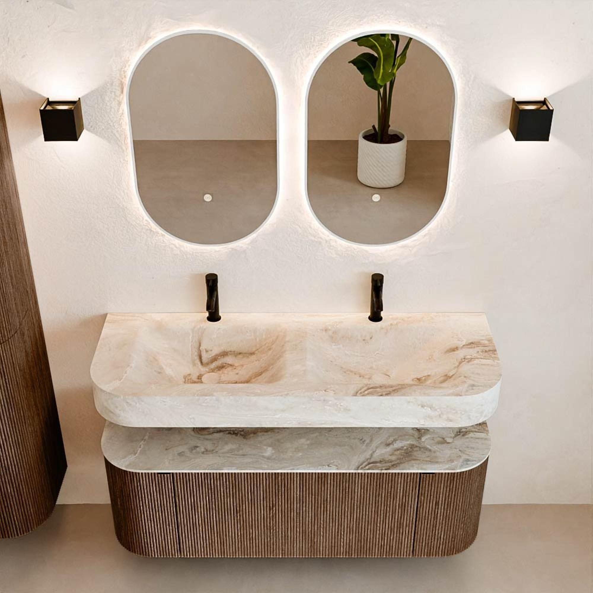 MONDIAZ THOR-DLUX 130cm badmeubel ronding links + rechts kleur Walnut met 1 lade en 2 deuren. Vrijhangende wastafel CLOUD Dubbel 2 kraangaten kleur Frappe.