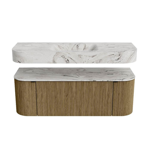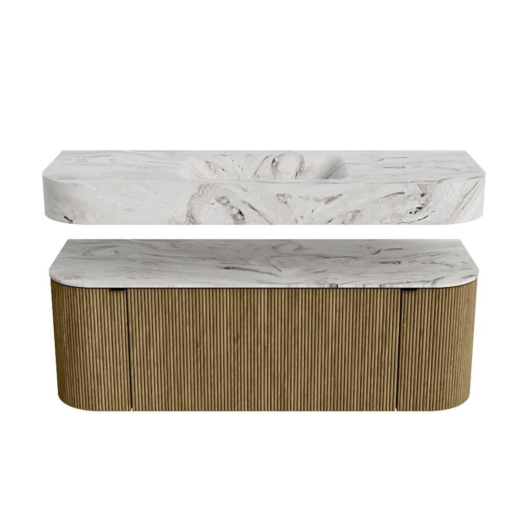 Boven het meubel zweeft een bijpassende, vrij hangende wastafel met afgeronde hoeken – perfect afgestemd op de vorm van de kast. De wastafel is uitgevoerd in Solid Surface en volgt subtiel de lijnen van het onderliggende meubel, waardoor een harmonieus geheel ontstaat. Het Solid Surface topblad vormt een sterke, onderhoudsvriendelijke basis en maakt de combinatie compleet.