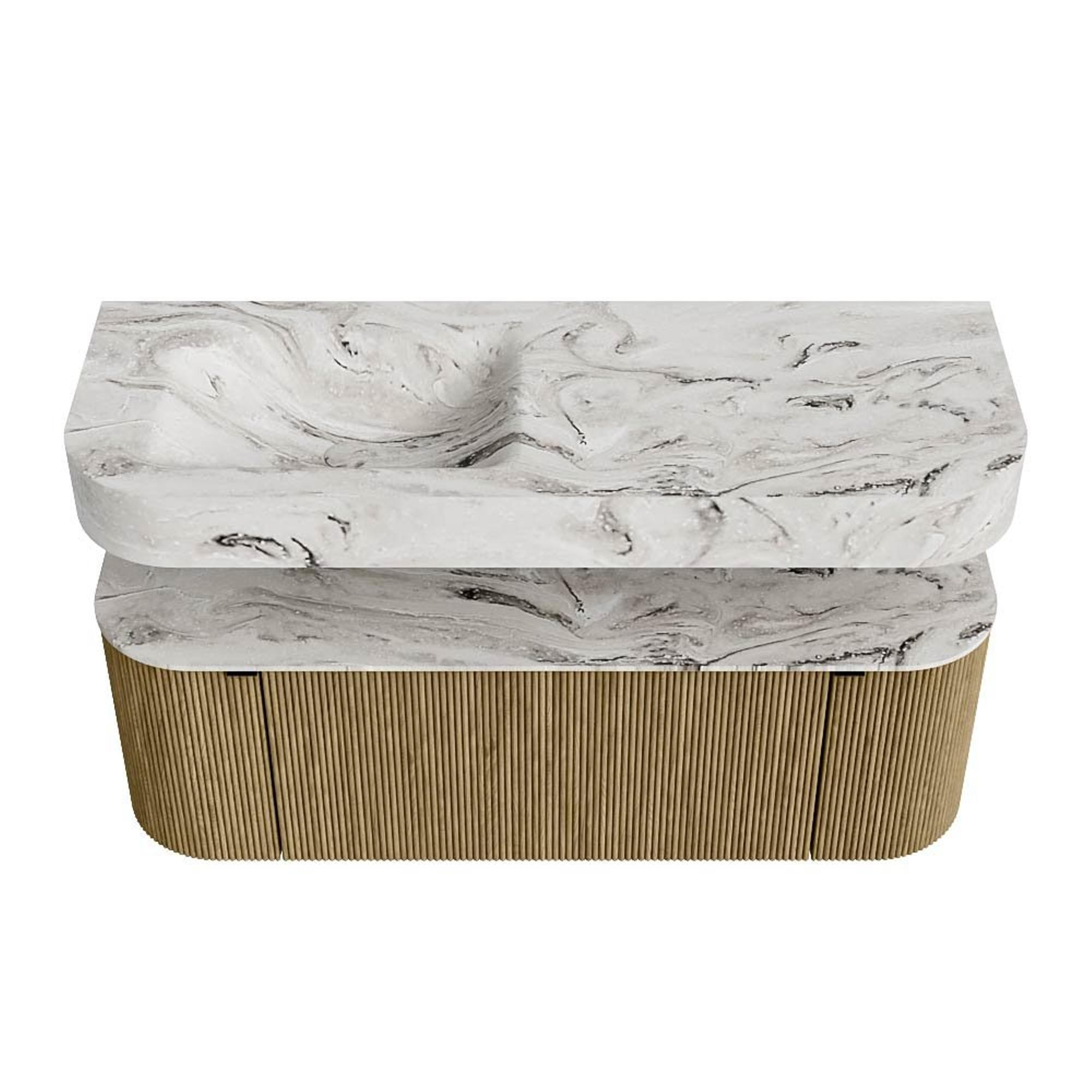MONDIAZ THOR-DLUX 130cm badmeubel ronding links + rechts kleur Dusk met 1 lade en 2 deuren. Vrijhangende wastafel CLOUD Links zonder kraangat kleur Glace.