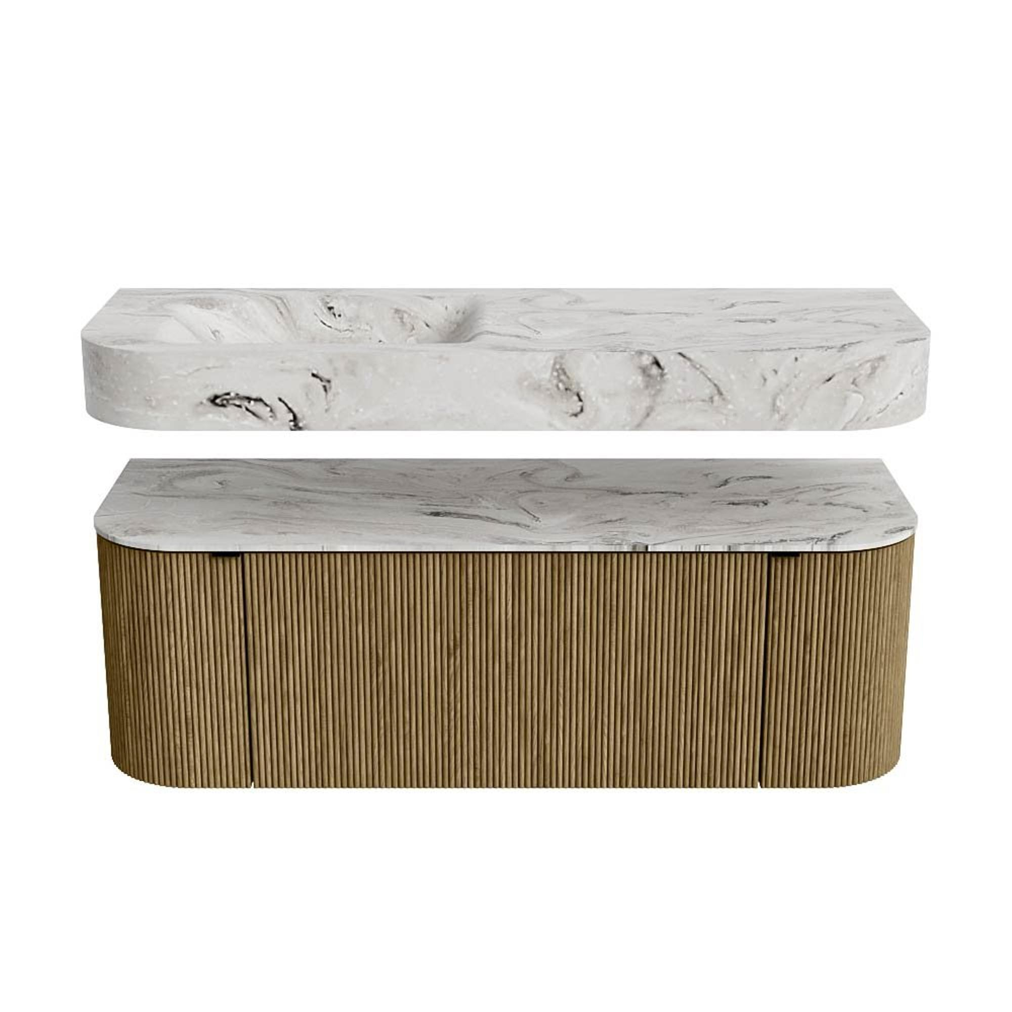 Boven het meubel zweeft een bijpassende, vrij hangende wastafel met afgeronde hoeken – perfect afgestemd op de vorm van de kast. De wastafel is uitgevoerd in Solid Surface en volgt subtiel de lijnen van het onderliggende meubel, waardoor een harmonieus geheel ontstaat. Het Solid Surface topblad vormt een sterke, onderhoudsvriendelijke basis en maakt de combinatie compleet.
