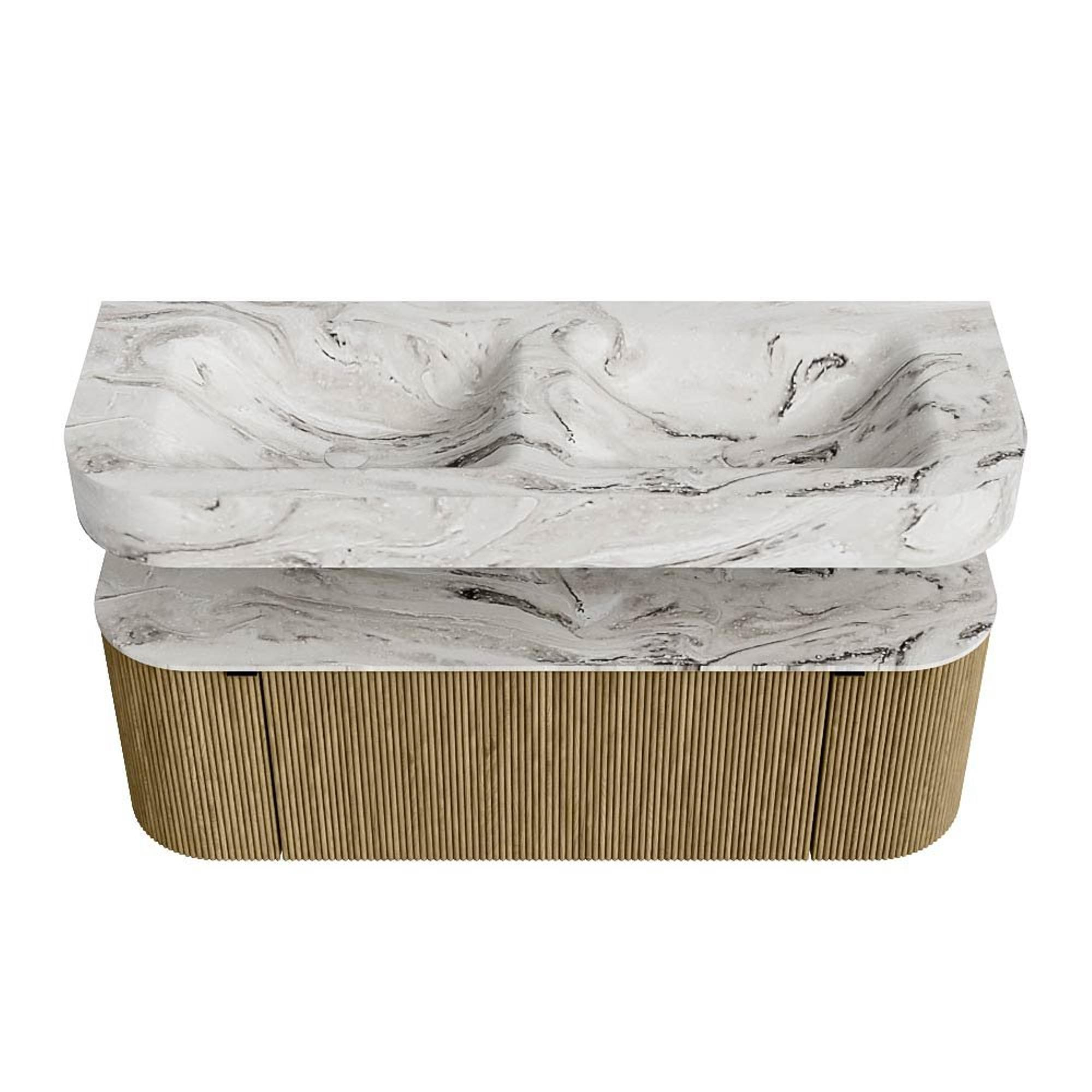 MONDIAZ THOR-DLUX 130cm badmeubel ronding links + rechts kleur Dusk met 1 lade en 2 deuren. Vrijhangende wastafel CLOUD Dubbel 2 kraangaten kleur Glace.