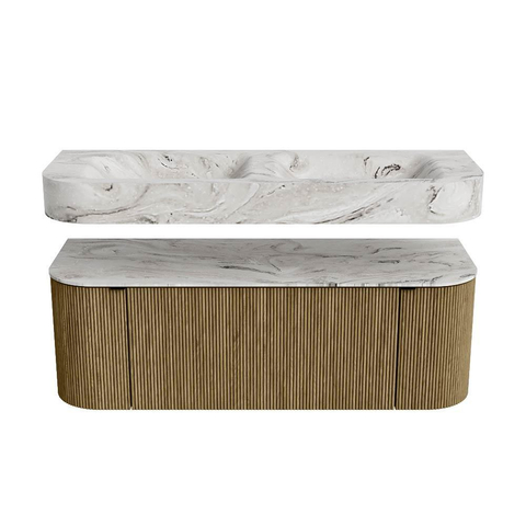 Boven het meubel zweeft een bijpassende, vrij hangende wastafel met afgeronde hoeken – perfect afgestemd op de vorm van de kast. De wastafel is uitgevoerd in Solid Surface en volgt subtiel de lijnen van het onderliggende meubel, waardoor een harmonieus geheel ontstaat. Het Solid Surface topblad vormt een sterke, onderhoudsvriendelijke basis en maakt de combinatie compleet.