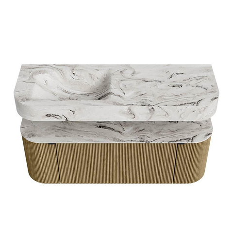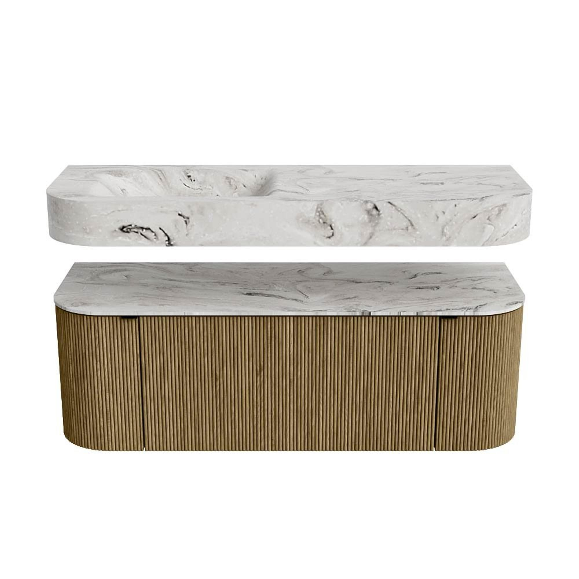 MONDIAZ THOR-DLUX 130cm badmeubel ronding links + rechts kleur Dusk met 1 lade en 2 deuren. Vrijhangende wastafel CLOUD Links 1 kraangat kleur Glace.