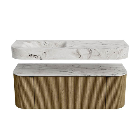 Boven het meubel zweeft een bijpassende, vrij hangende wastafel met afgeronde hoeken – perfect afgestemd op de vorm van de kast. De wastafel is uitgevoerd in Solid Surface en volgt subtiel de lijnen van het onderliggende meubel, waardoor een harmonieus geheel ontstaat. Het Solid Surface topblad vormt een sterke, onderhoudsvriendelijke basis en maakt de combinatie compleet.