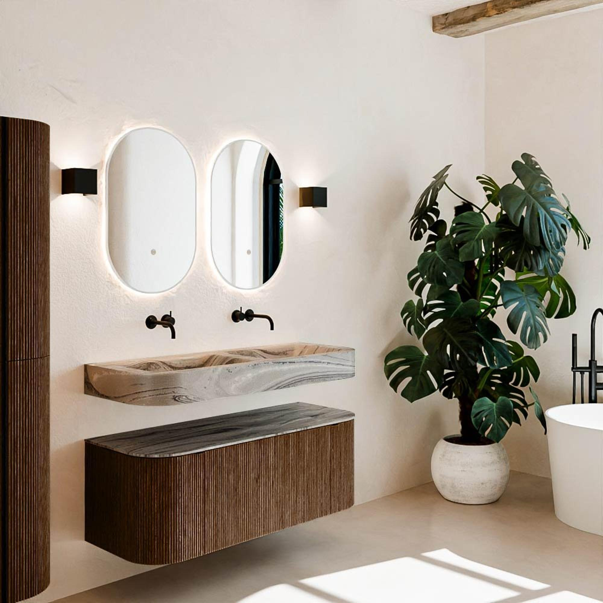 Natuurlijke materialen in warme tinten. De verticale ribbels brengen ritme en textuur in het ontwerp, terwijl het eikenhout zorgt voor een warme, ambachtelijke uitstraling. Kies uit 5 houttinten OAK, WALNUT, DUSK, SHADOW en RUBY zorgvuldig geselecteerde houtkleuren om zowel moderne als klassieke badkamers te verrijken.