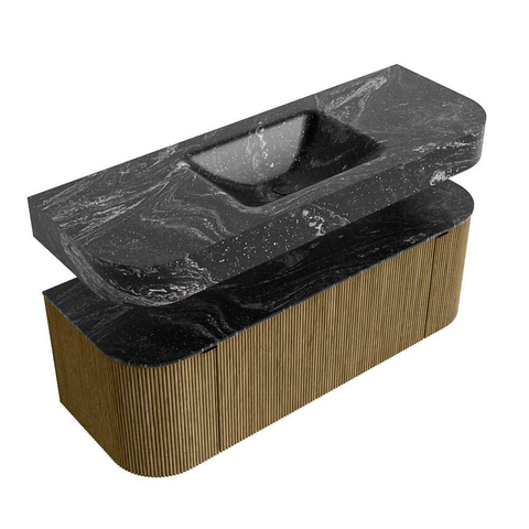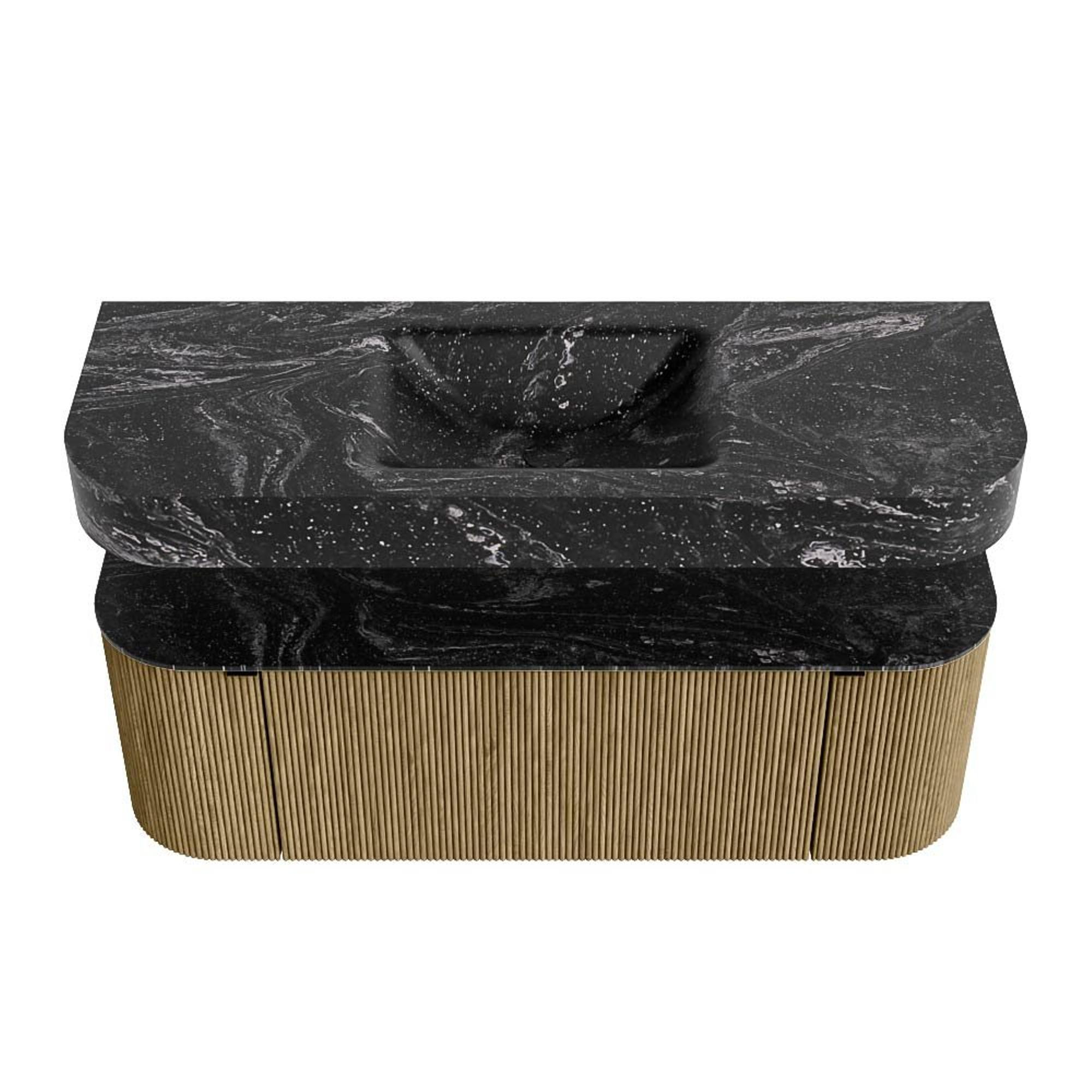 MONDIAZ THOR-DLUX 130cm badmeubel ronding links + rechts kleur Dusk met 1 lade en 2 deuren. Vrijhangende wastafel CLOUD Midden zonder kraangat kleur Lava.