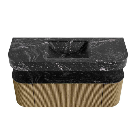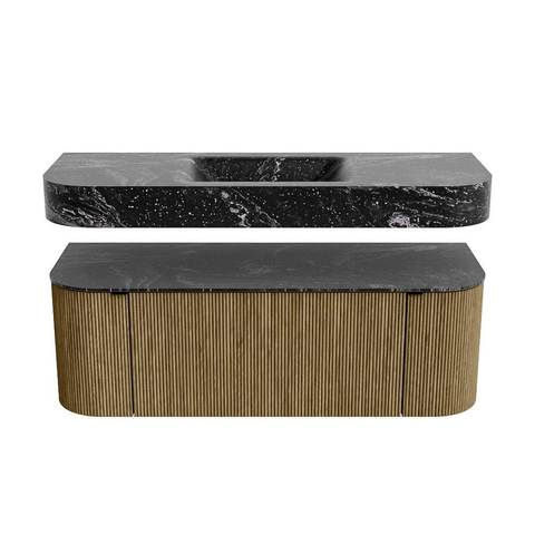Boven het meubel zweeft een bijpassende, vrij hangende wastafel met afgeronde hoeken – perfect afgestemd op de vorm van de kast. De wastafel is uitgevoerd in Solid Surface en volgt subtiel de lijnen van het onderliggende meubel, waardoor een harmonieus geheel ontstaat. Het Solid Surface topblad vormt een sterke, onderhoudsvriendelijke basis en maakt de combinatie compleet.
