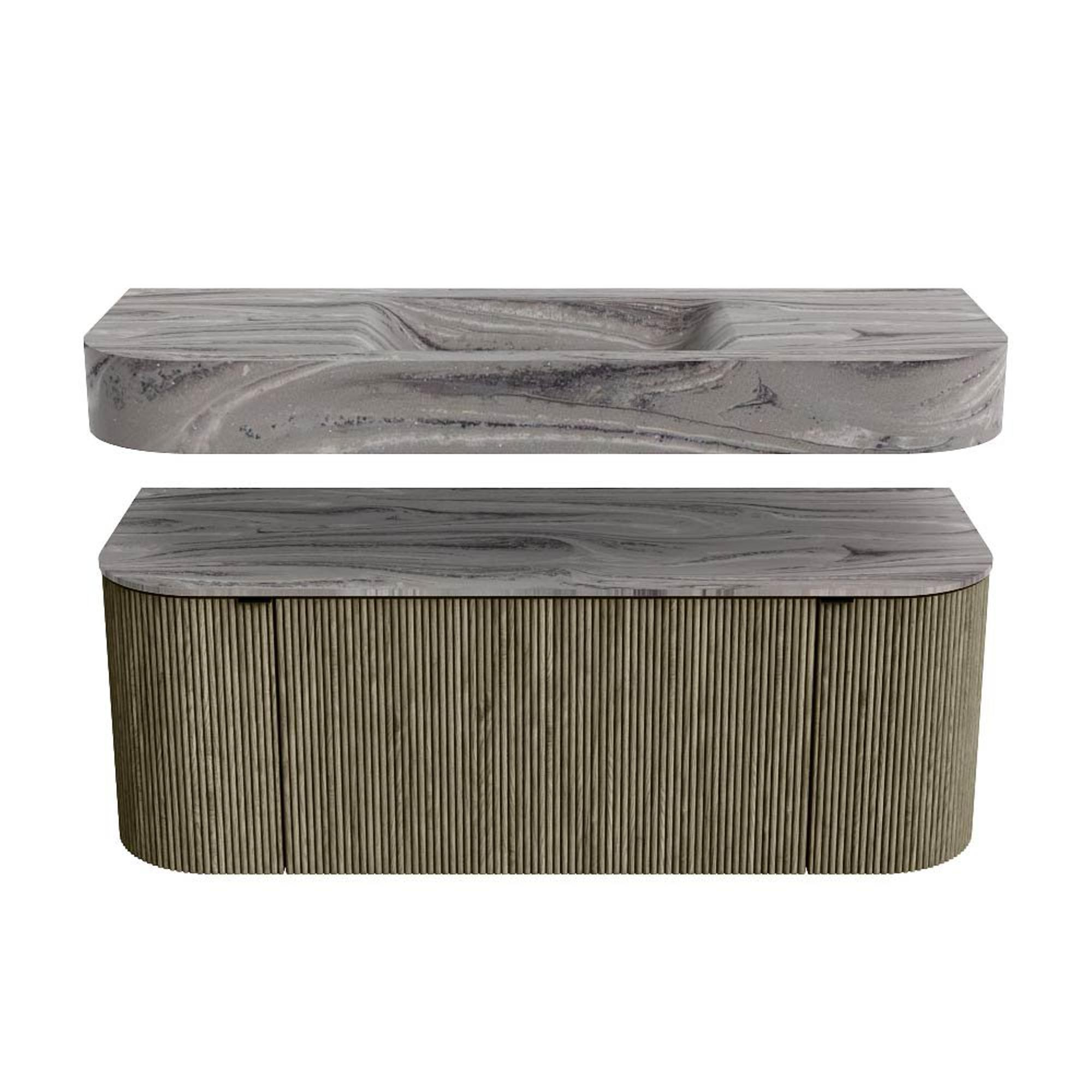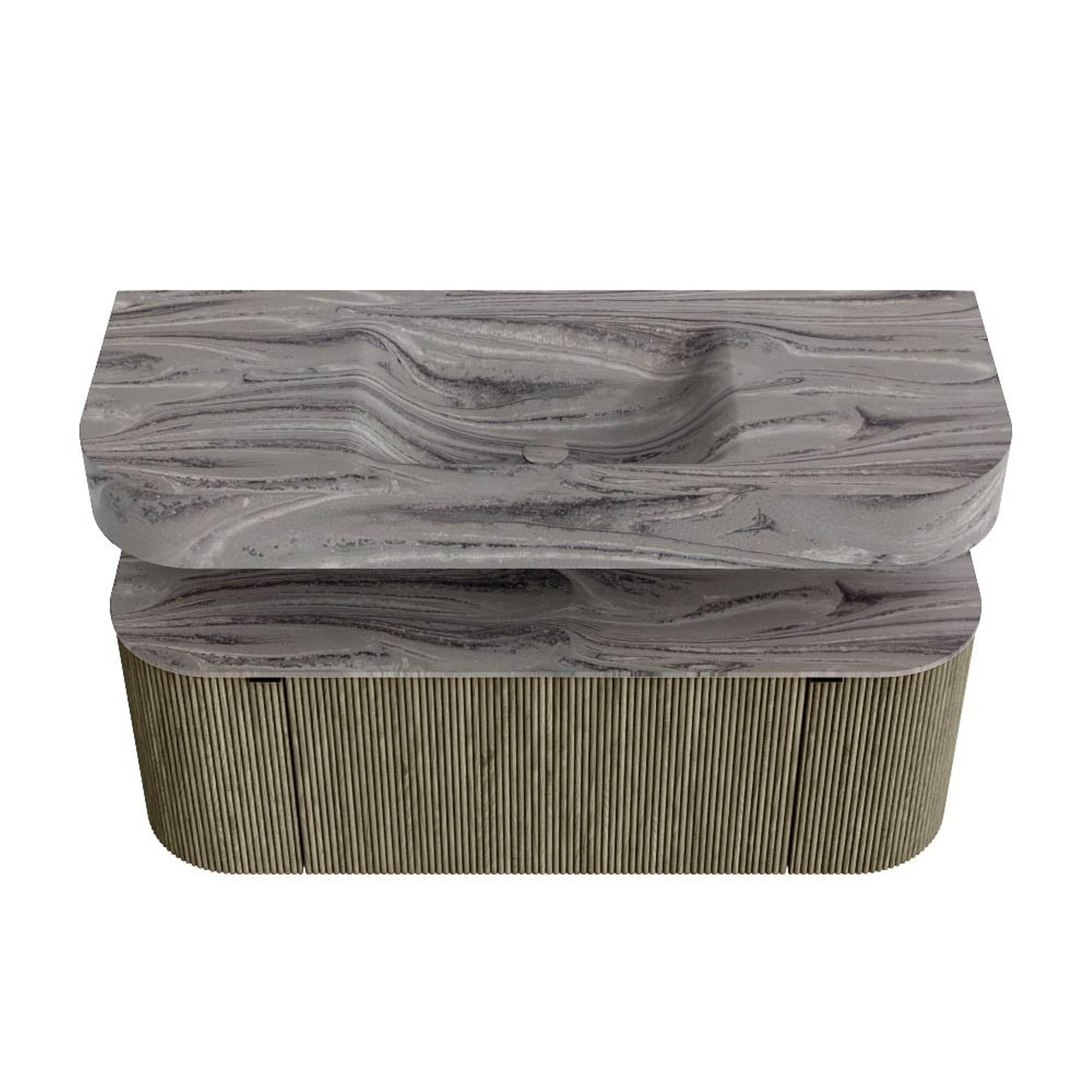 MONDIAZ THOR-DLUX 120cm badmeubel ronding links + rechts kleur Shadow met 1 lade en 2 deuren. Vrijhangende wastafel CLOUD Midden zonder kraangat kleur Sombra.