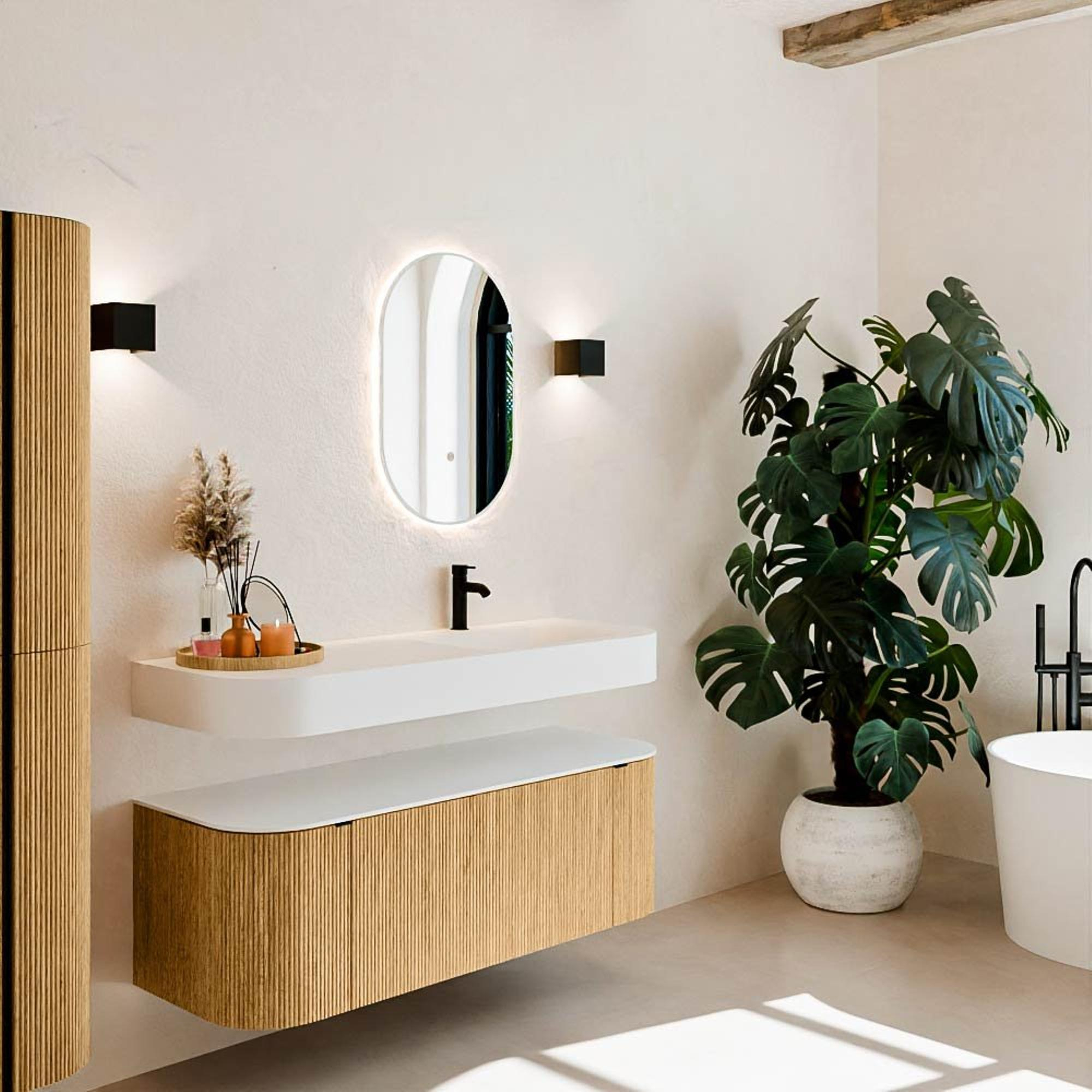 Natuurlijke materialen in warme tinten. De verticale ribbels brengen ritme en textuur in het ontwerp, terwijl het eikenhout zorgt voor een warme, ambachtelijke uitstraling. Kies uit 5 houttinten OAK, WALNUT, DUSK, SHADOW en RUBY zorgvuldig geselecteerde houtkleuren om zowel moderne als klassieke badkamers te verrijken.