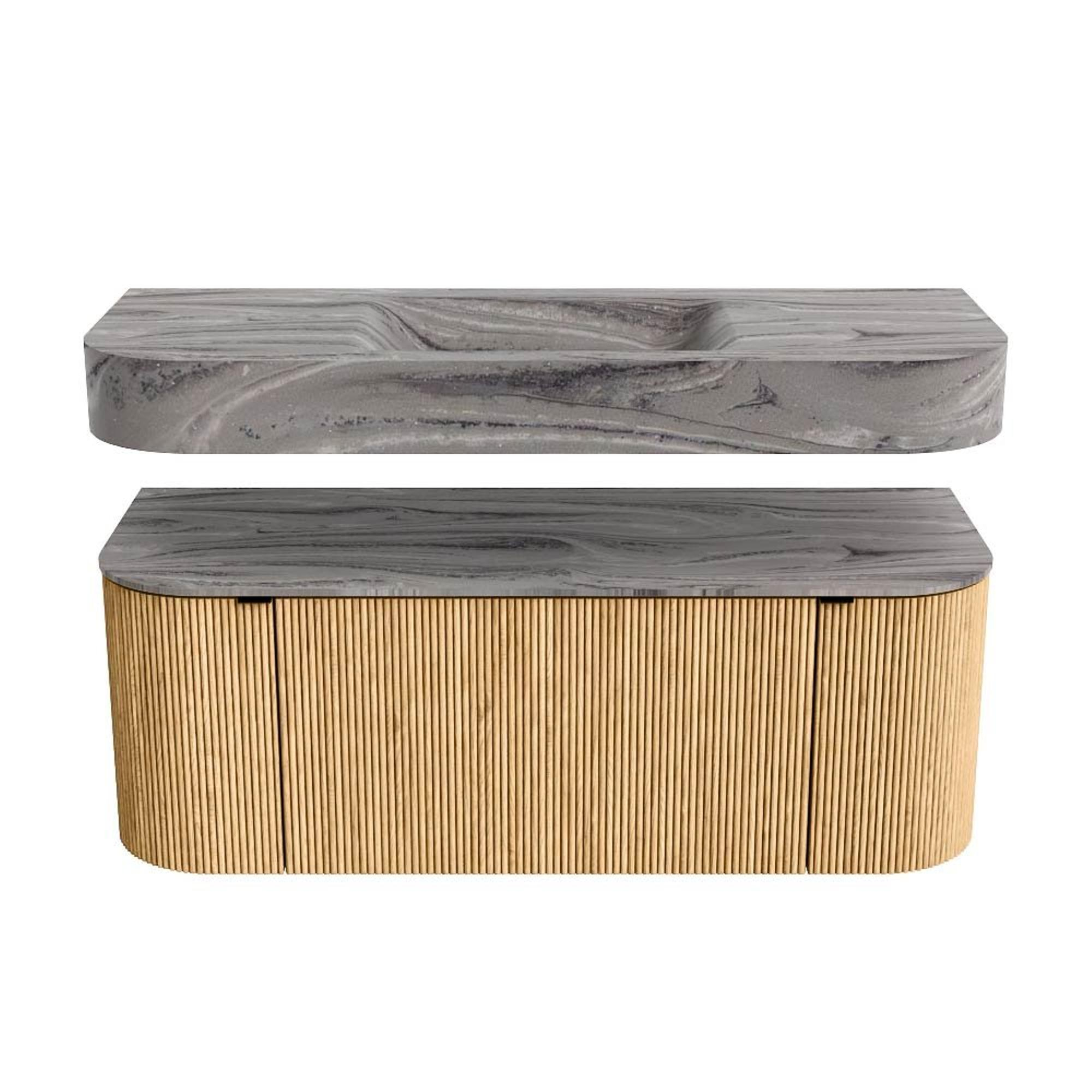 Boven het meubel zweeft een bijpassende, vrij hangende wastafel met afgeronde hoeken – perfect afgestemd op de vorm van de kast. De wastafel is uitgevoerd in Solid Surface en volgt subtiel de lijnen van het onderliggende meubel, waardoor een harmonieus geheel ontstaat. Het Solid Surface topblad vormt een sterke, onderhoudsvriendelijke basis en maakt de combinatie compleet.