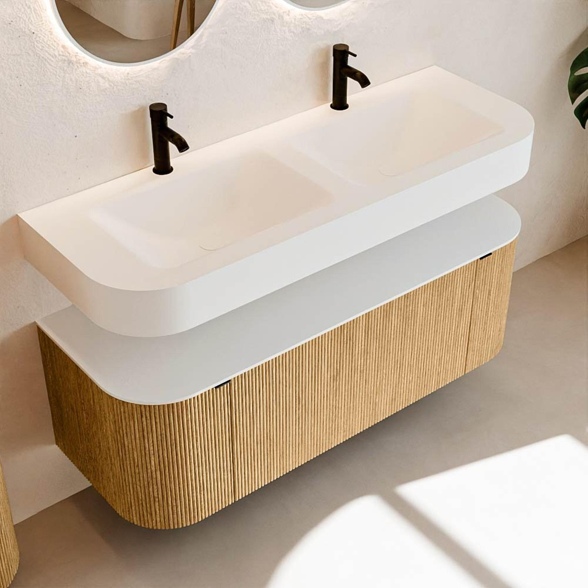 Boven het meubel zweeft een bijpassende, vrij hangende wastafel met afgeronde hoeken – perfect afgestemd op de vorm van de kast. De wastafel is uitgevoerd in Solid Surface en volgt subtiel de lijnen van het onderliggende meubel, waardoor een harmonieus geheel ontstaat. Het Solid Surface topblad vormt een sterke, onderhoudsvriendelijke basis en maakt de combinatie compleet.