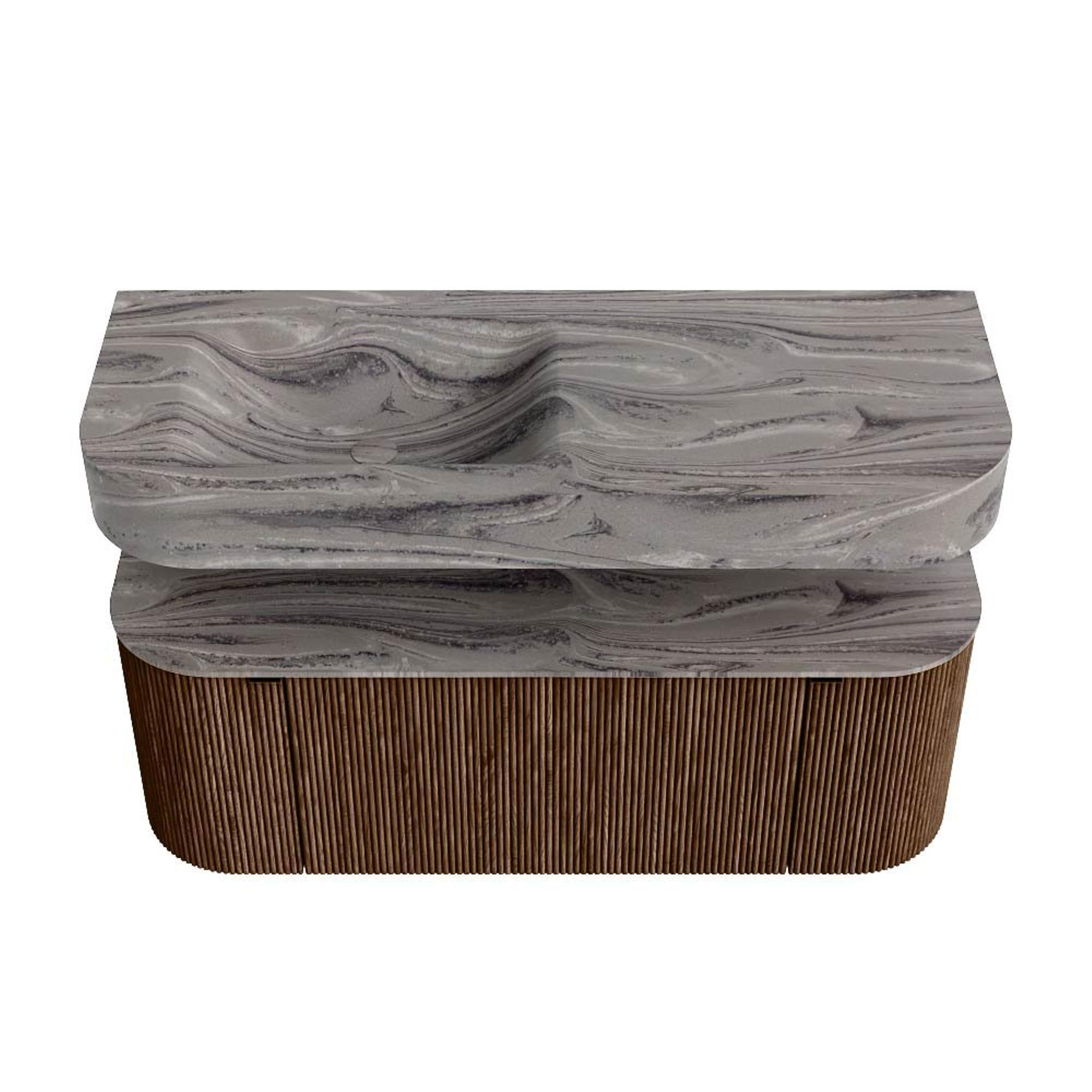 MONDIAZ THOR-DLUX 120cm badmeubel ronding links + rechts kleur Walnut met 1 lade en 2 deuren. Vrijhangende wastafel CLOUD Links zonder kraangat kleur Sombra.