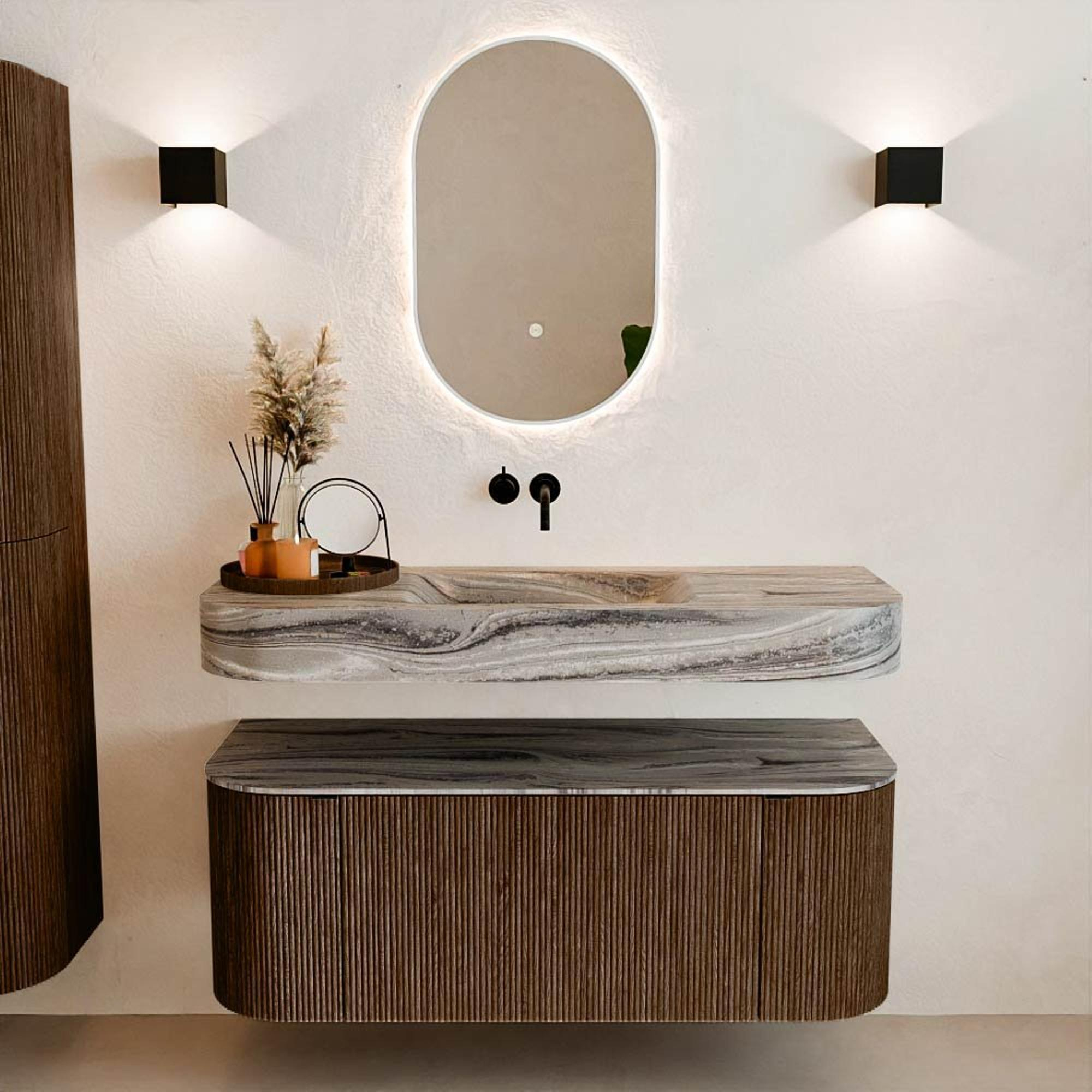 Natuurlijke materialen in warme tinten. De verticale ribbels brengen ritme en textuur in het ontwerp, terwijl het eikenhout zorgt voor een warme, ambachtelijke uitstraling. Kies uit 5 houttinten OAK, WALNUT, DUSK, SHADOW en RUBY zorgvuldig geselecteerde houtkleuren om zowel moderne als klassieke badkamers te verrijken.