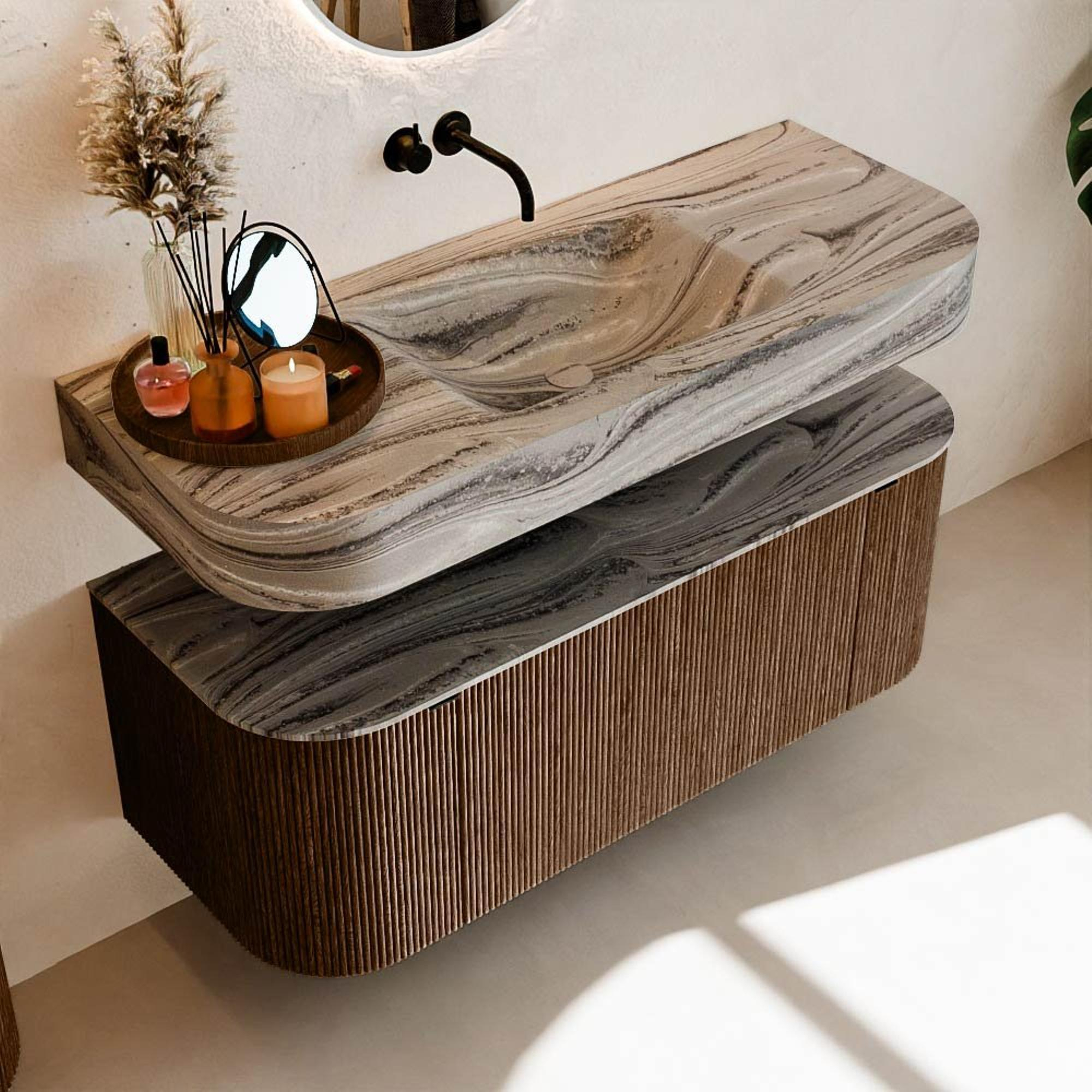 MONDIAZ THOR-DLUX 120cm badmeubel ronding links + rechts kleur Walnut met 1 lade en 2 deuren. Vrijhangende wastafel CLOUD Midden zonder kraangat kleur Sombra.