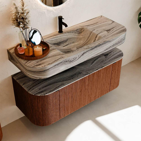 MONDIAZ THOR-DLUX 120cm badmeubel ronding links + rechts kleur Ruby met 1 lade en 2 deuren. Vrijhangende wastafel CLOUD Midden 1 kraangat kleur Sombra.