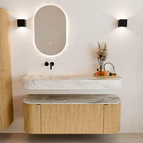 Natuurlijke materialen in warme tinten. De verticale ribbels brengen ritme en textuur in het ontwerp, terwijl het eikenhout zorgt voor een warme, ambachtelijke uitstraling. Kies uit 5 houttinten OAK, WALNUT, DUSK, SHADOW en RUBY zorgvuldig geselecteerde houtkleuren om zowel moderne als klassieke badkamers te verrijken.