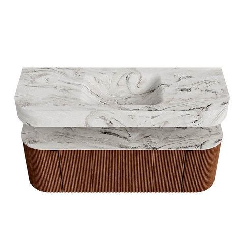 MONDIAZ THOR-DLUX 130cm badmeubel ronding links + rechts kleur Ruby met 1 lade en 2 deuren. Vrijhangende wastafel CLOUD Midden zonder kraangat kleur Glace.