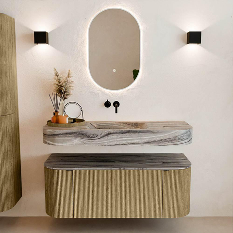 Natuurlijke materialen in warme tinten. De verticale ribbels brengen ritme en textuur in het ontwerp, terwijl het eikenhout zorgt voor een warme, ambachtelijke uitstraling. Kies uit 5 houttinten OAK, WALNUT, DUSK, SHADOW en RUBY zorgvuldig geselecteerde houtkleuren om zowel moderne als klassieke badkamers te verrijken.