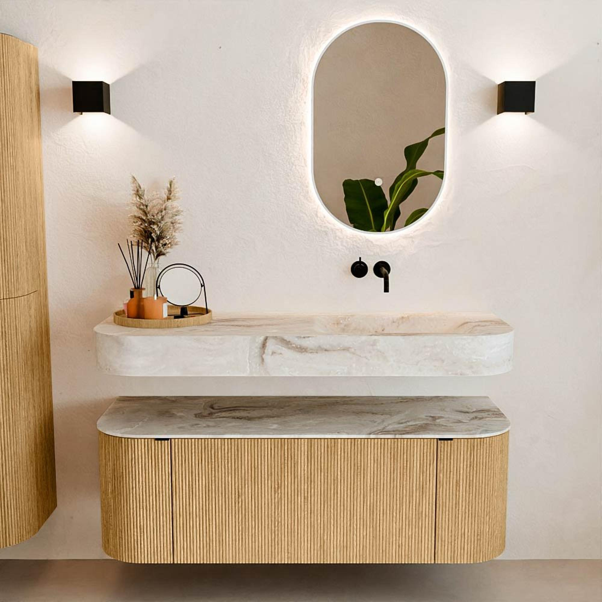 Natuurlijke materialen in warme tinten. De verticale ribbels brengen ritme en textuur in het ontwerp, terwijl het eikenhout zorgt voor een warme, ambachtelijke uitstraling. Kies uit 5 houttinten OAK, WALNUT, DUSK, SHADOW en RUBY zorgvuldig geselecteerde houtkleuren om zowel moderne als klassieke badkamers te verrijken.