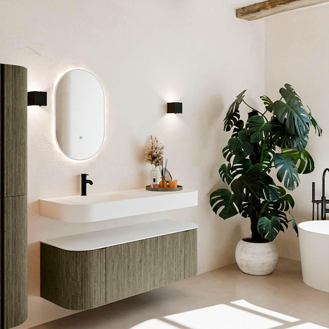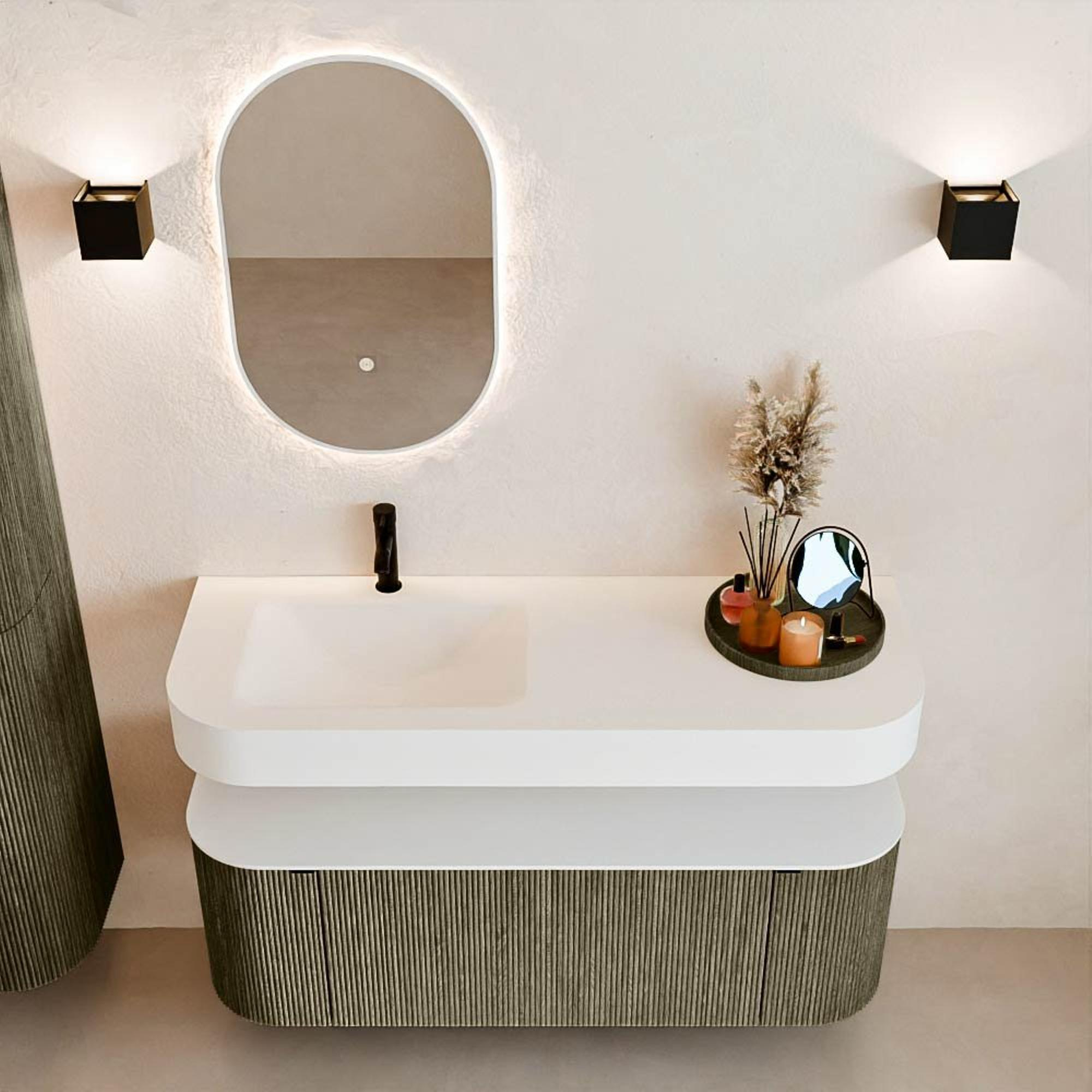 Boven het meubel zweeft een bijpassende, vrij hangende wastafel met afgeronde hoeken – perfect afgestemd op de vorm van de kast. De wastafel is uitgevoerd in Solid Surface en volgt subtiel de lijnen van het onderliggende meubel, waardoor een harmonieus geheel ontstaat. Het Solid Surface topblad vormt een sterke, onderhoudsvriendelijke basis en maakt de combinatie compleet.