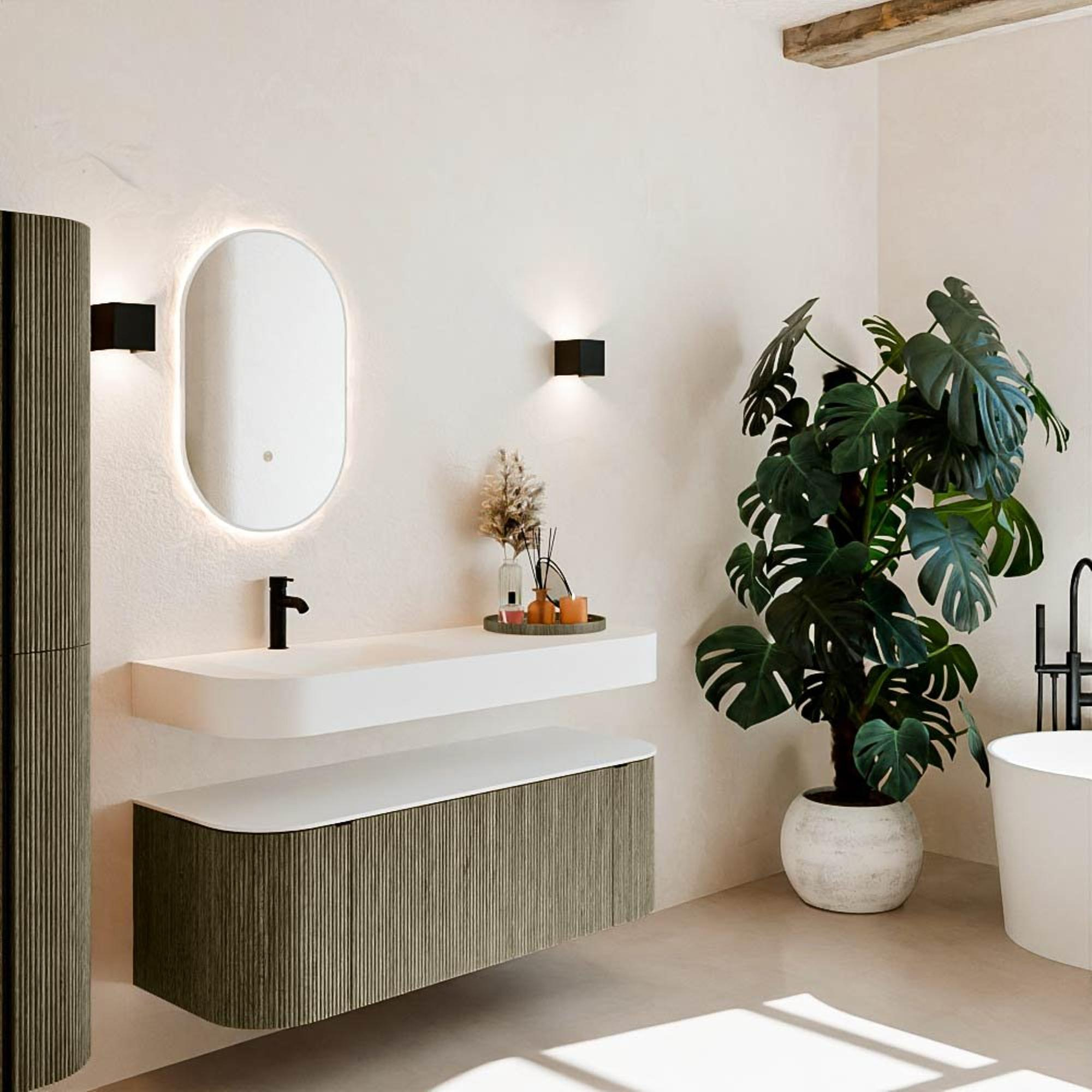 Natuurlijke materialen in warme tinten. De verticale ribbels brengen ritme en textuur in het ontwerp, terwijl het eikenhout zorgt voor een warme, ambachtelijke uitstraling. Kies uit 5 houttinten OAK, WALNUT, DUSK, SHADOW en RUBY zorgvuldig geselecteerde houtkleuren om zowel moderne als klassieke badkamers te verrijken.