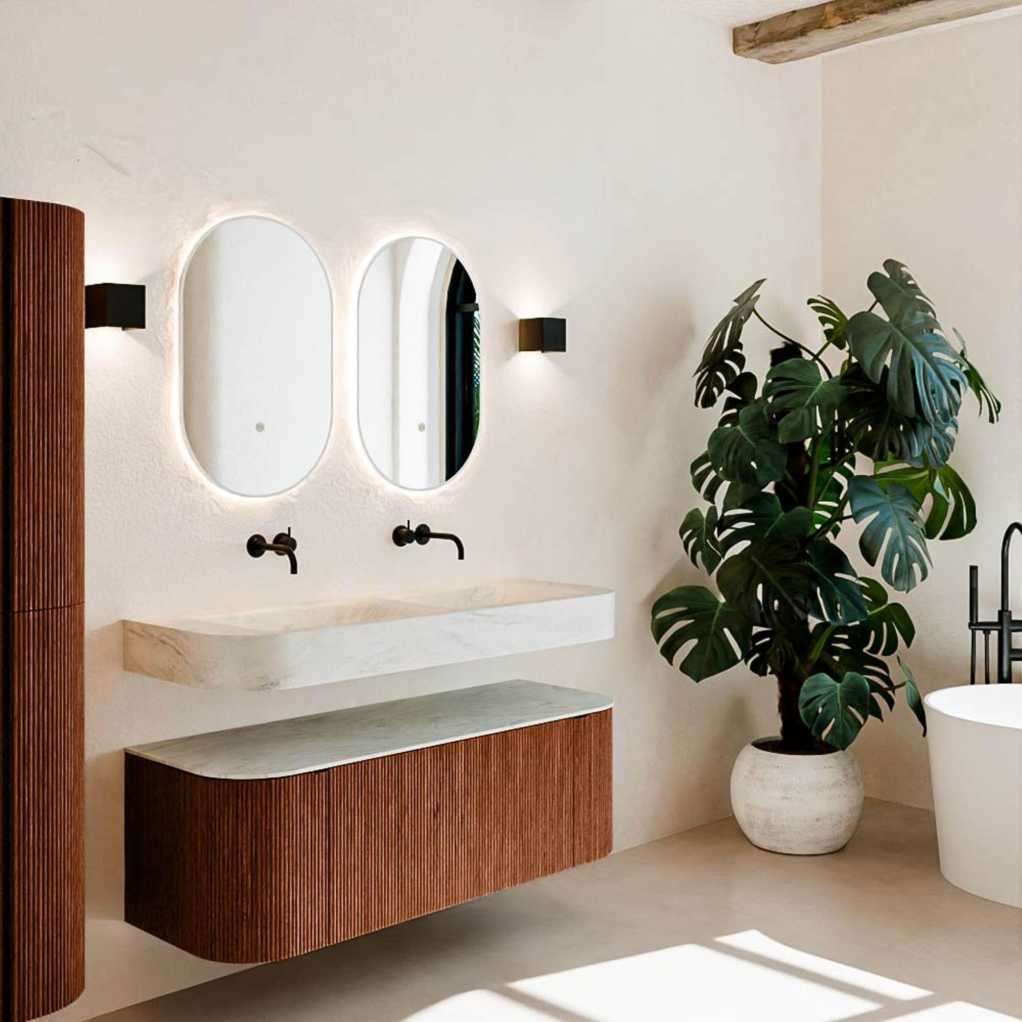 Natuurlijke materialen in warme tinten. De verticale ribbels brengen ritme en textuur in het ontwerp, terwijl het eikenhout zorgt voor een warme, ambachtelijke uitstraling. Kies uit 5 houttinten OAK, WALNUT, DUSK, SHADOW en RUBY zorgvuldig geselecteerde houtkleuren om zowel moderne als klassieke badkamers te verrijken.