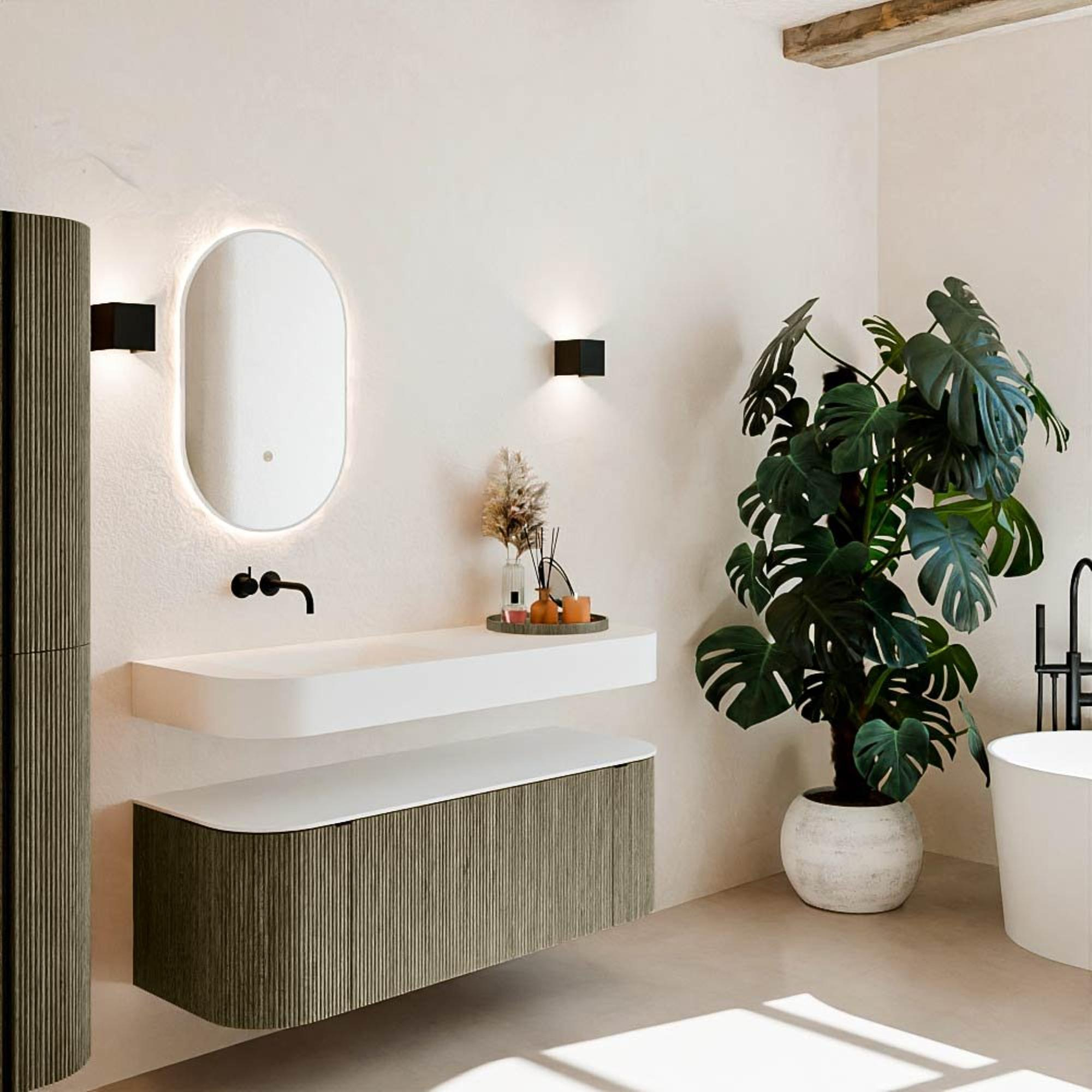 Natuurlijke materialen in warme tinten. De verticale ribbels brengen ritme en textuur in het ontwerp, terwijl het eikenhout zorgt voor een warme, ambachtelijke uitstraling. Kies uit 5 houttinten OAK, WALNUT, DUSK, SHADOW en RUBY zorgvuldig geselecteerde houtkleuren om zowel moderne als klassieke badkamers te verrijken.