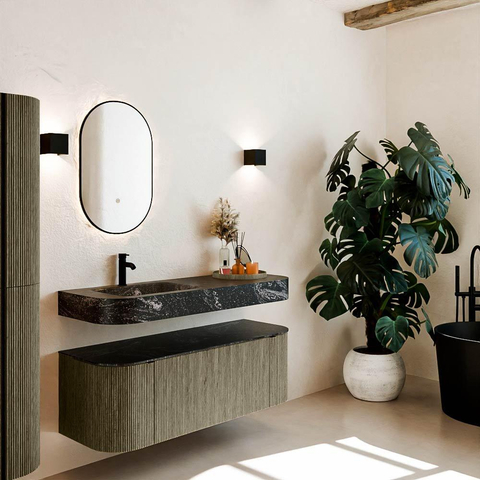 MONDIAZ THOR-DLUX 130cm badmeubel ronding links + rechts kleur Shadow met 1 lade en 2 deuren. Vrijhangende wastafel CLOUD Links 1 kraangat kleur Lava.