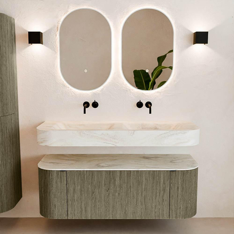 Natuurlijke materialen in warme tinten. De verticale ribbels brengen ritme en textuur in het ontwerp, terwijl het eikenhout zorgt voor een warme, ambachtelijke uitstraling. Kies uit 5 houttinten OAK, WALNUT, DUSK, SHADOW en RUBY zorgvuldig geselecteerde houtkleuren om zowel moderne als klassieke badkamers te verrijken.