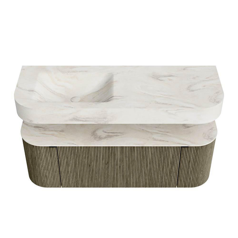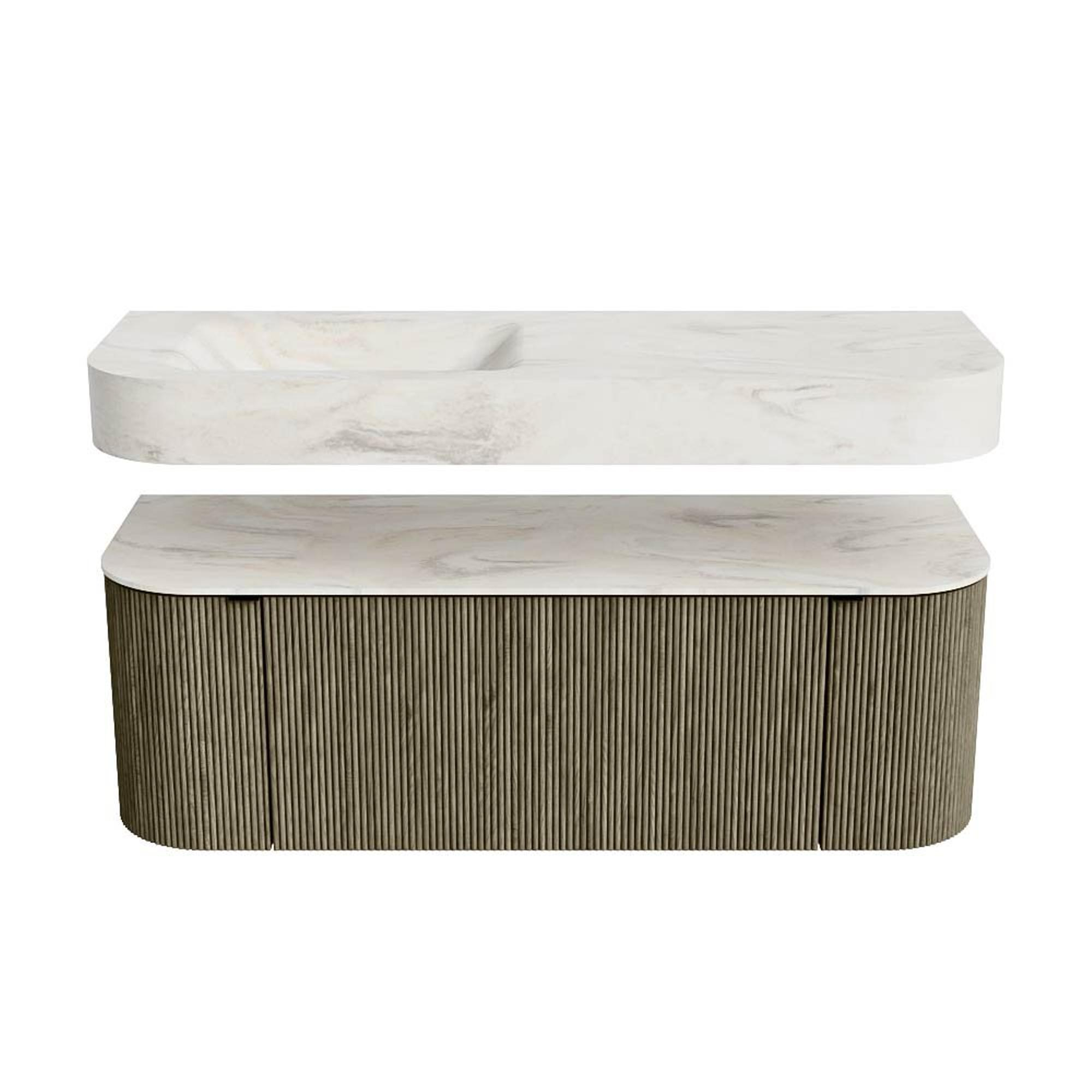 MONDIAZ THOR-DLUX 130cm badmeubel ronding links + rechts kleur Shadow met 1 lade en 2 deuren. Vrijhangende wastafel CLOUD Links zonder kraangat kleur Ostra.