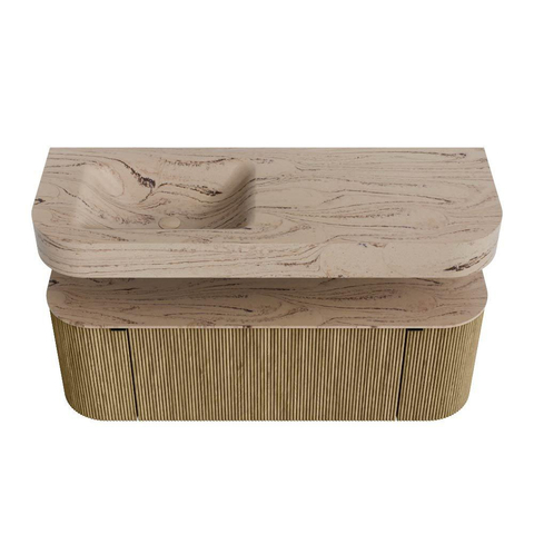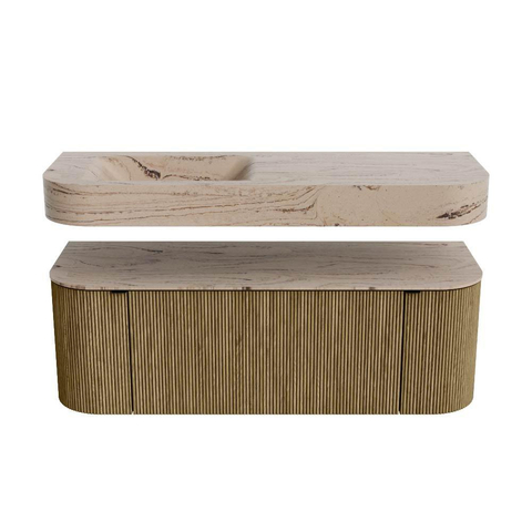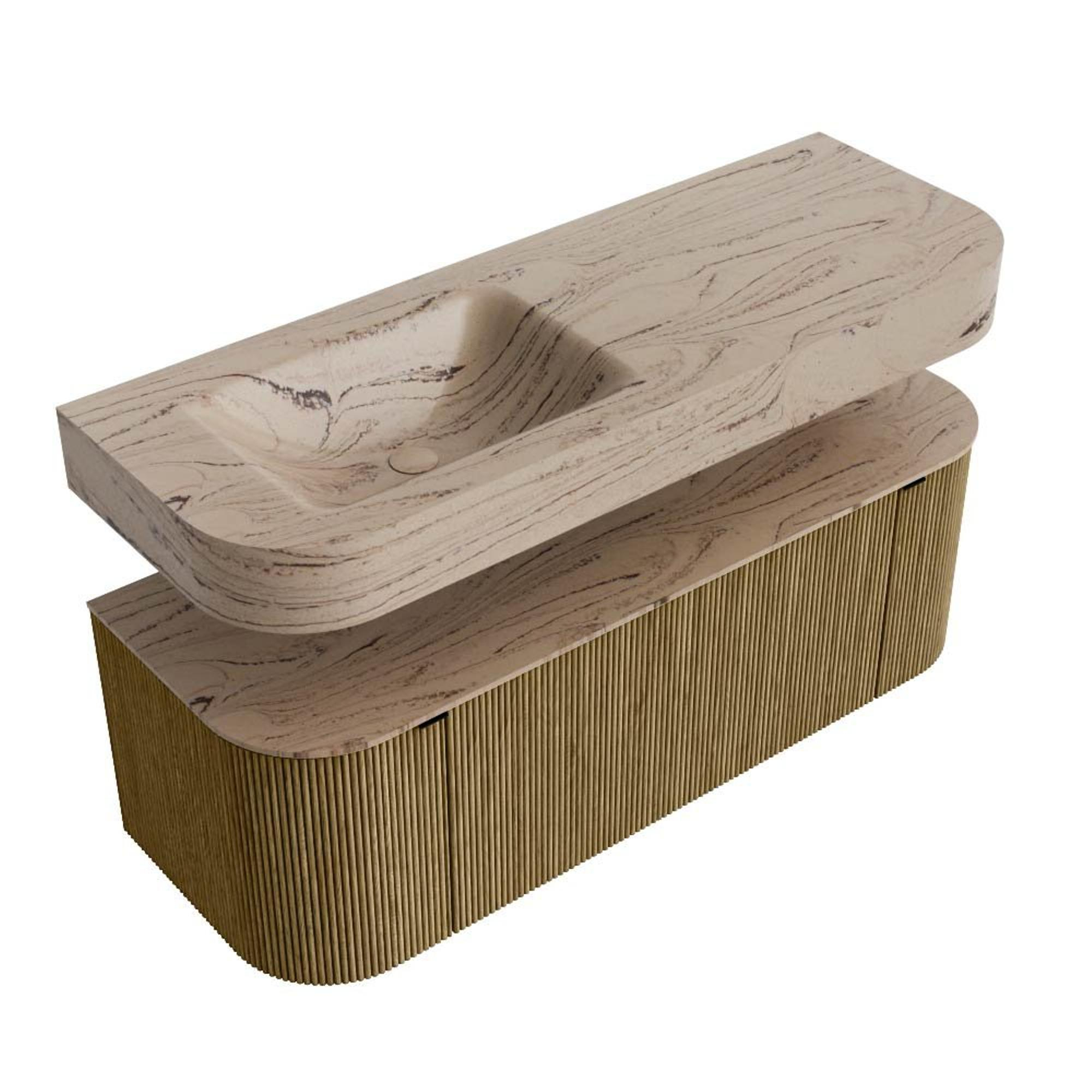 MONDIAZ THOR-DLUX 130cm badmeubel ronding links + rechts kleur Dusk met 1 lade en 2 deuren. Vrijhangende wastafel CLOUD Links 1 kraangat kleur Arena.