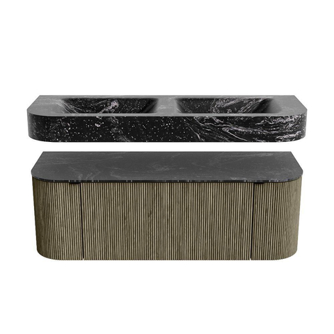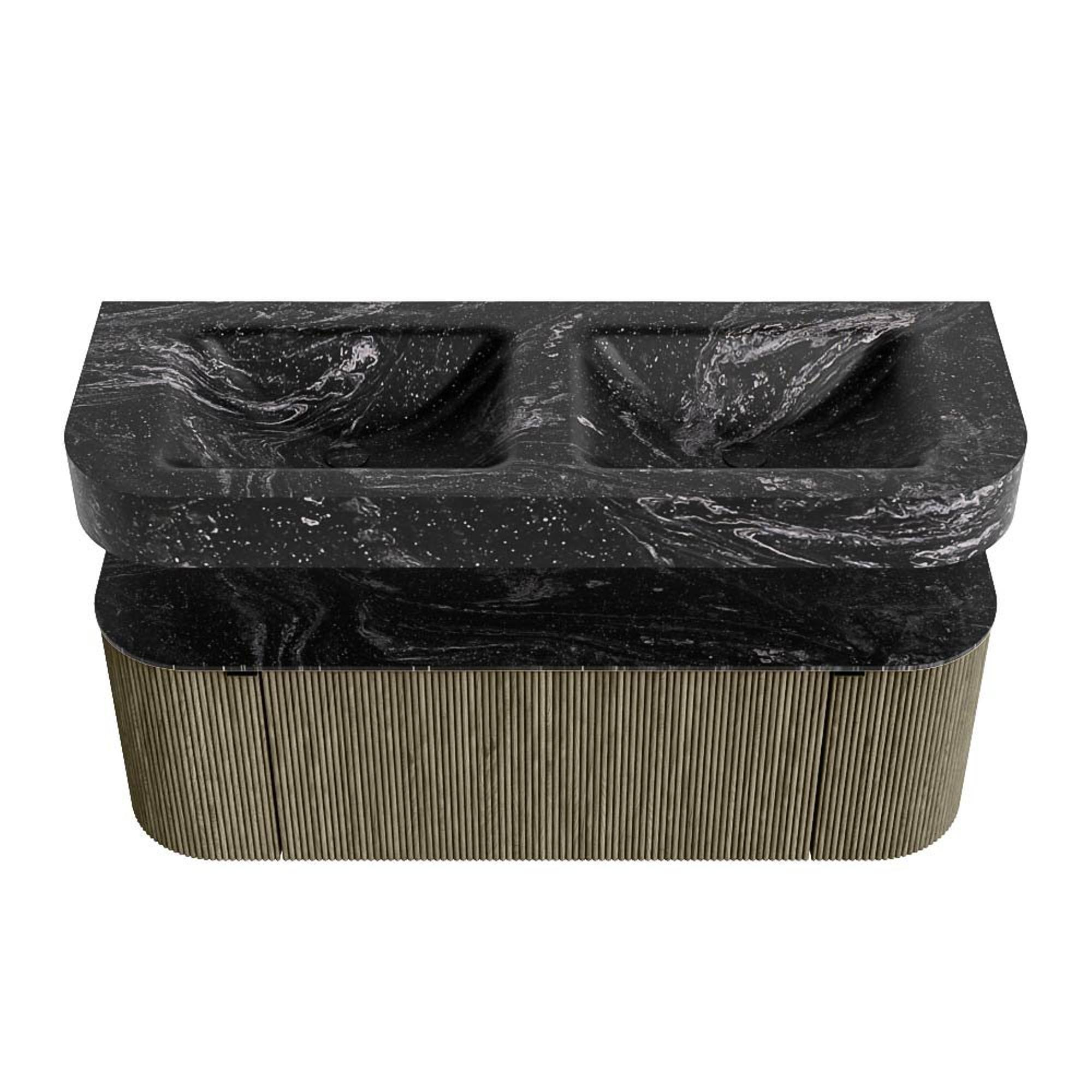 MONDIAZ THOR-DLUX 130cm badmeubel ronding links + rechts kleur Shadow met 1 lade en 2 deuren. Vrijhangende wastafel CLOUD Dubbel 2 kraangaten kleur Lava.