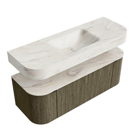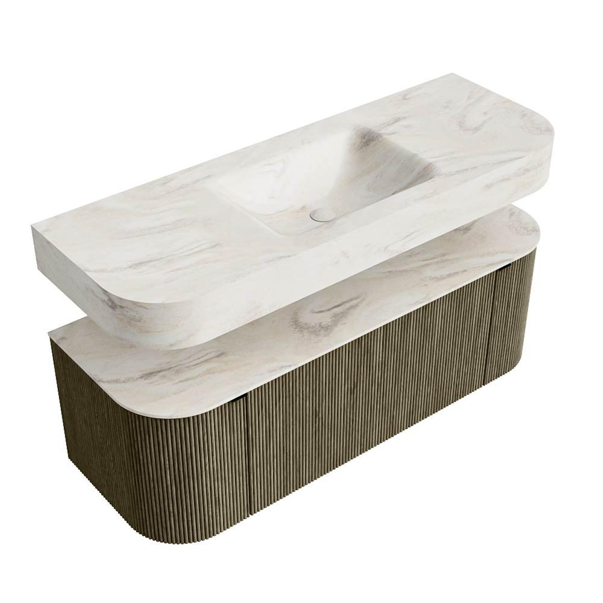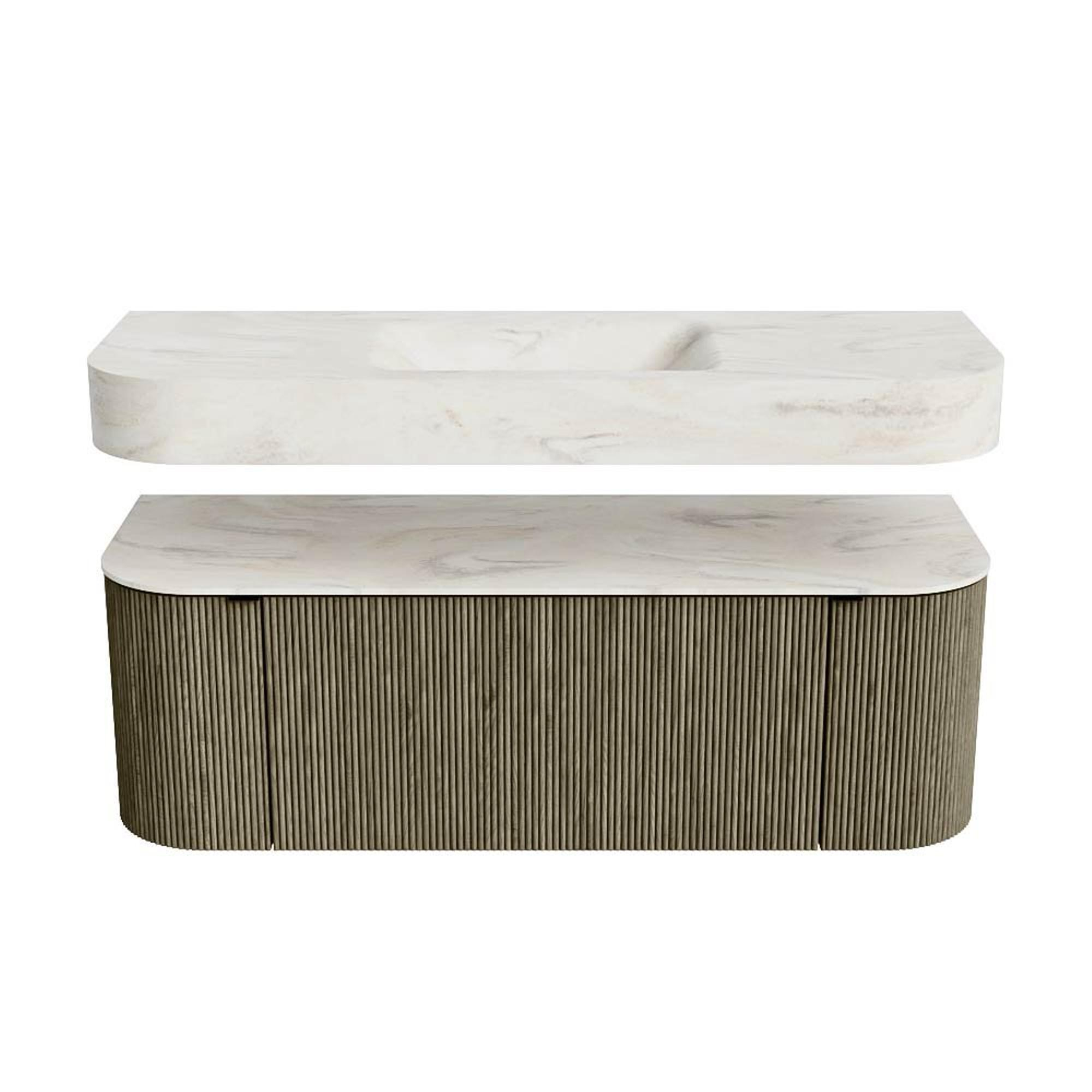 MONDIAZ THOR-DLUX 130cm badmeubel ronding links + rechts kleur Shadow met 1 lade en 2 deuren. Vrijhangende wastafel CLOUD Midden zonder kraangat kleur Ostra.