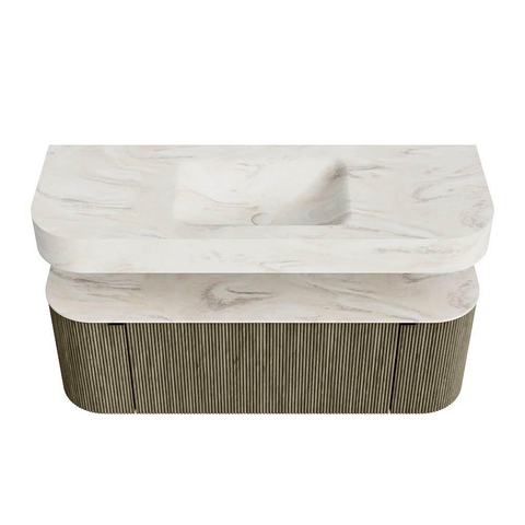 Boven het meubel zweeft een bijpassende, vrij hangende wastafel met afgeronde hoeken – perfect afgestemd op de vorm van de kast. De wastafel is uitgevoerd in Solid Surface en volgt subtiel de lijnen van het onderliggende meubel, waardoor een harmonieus geheel ontstaat. Het Solid Surface topblad vormt een sterke, onderhoudsvriendelijke basis en maakt de combinatie compleet.
