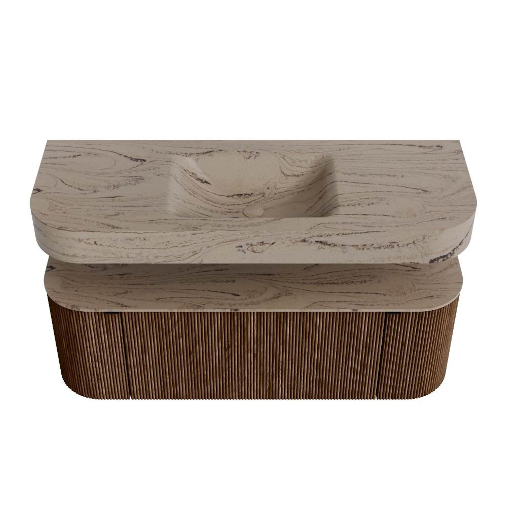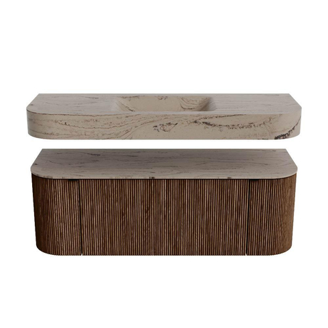 MONDIAZ THOR-DLUX 130cm badmeubel ronding links + rechts kleur Walnut met 1 lade en 2 deuren. Vrijhangende wastafel CLOUD Midden 1 kraangat kleur Arena.