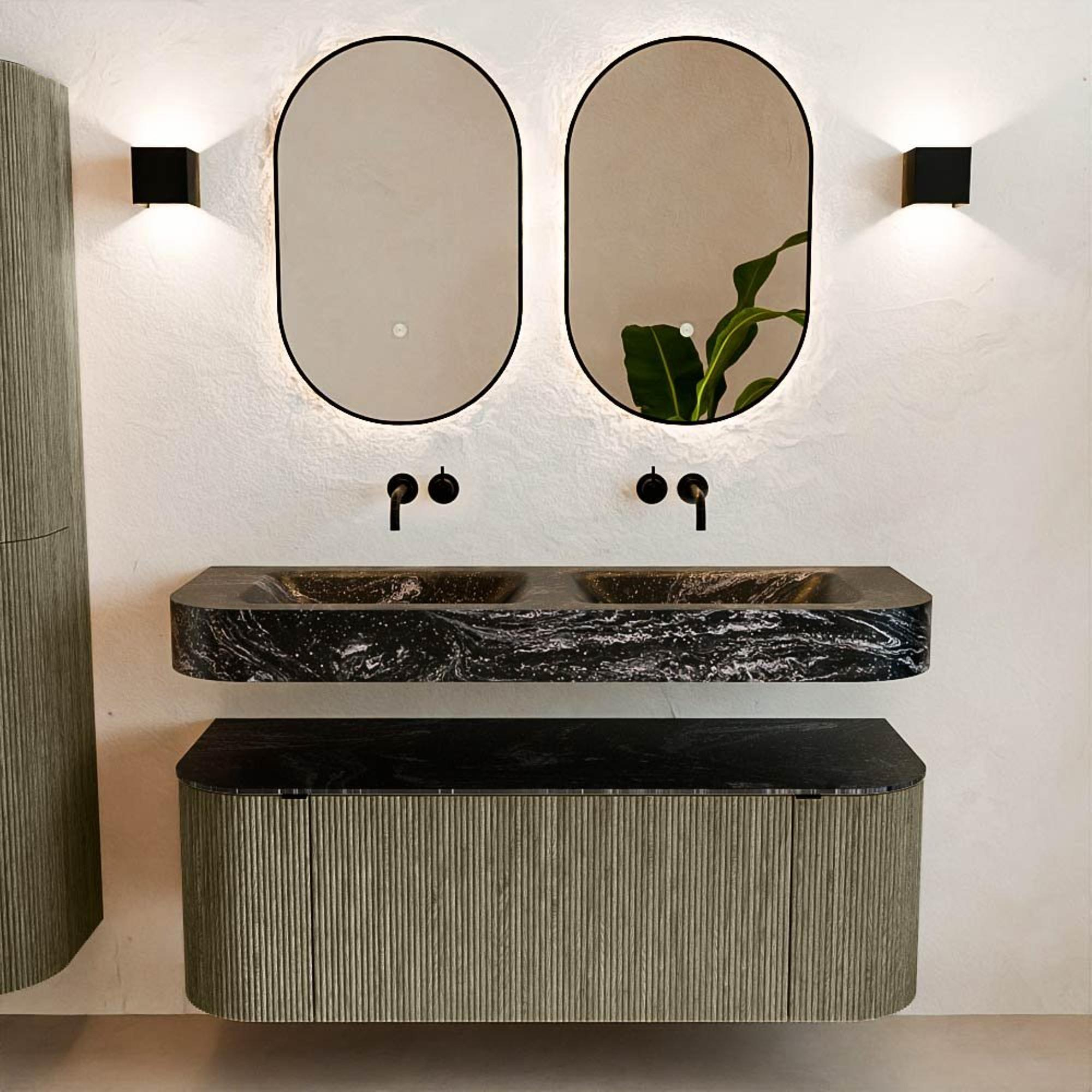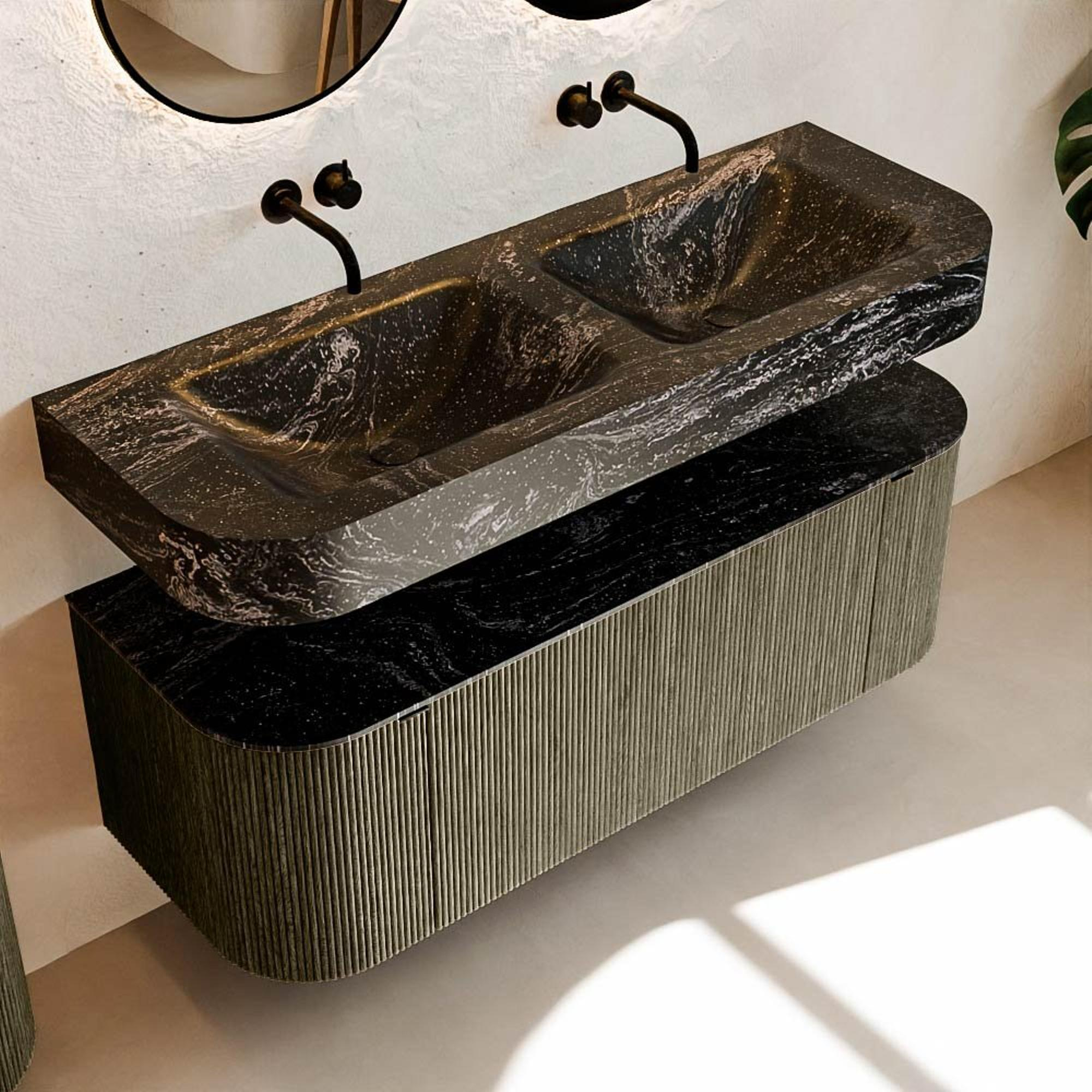 MONDIAZ THOR-DLUX 130cm badmeubel ronding links + rechts kleur Shadow met 1 lade en 2 deuren. Vrijhangende wastafel CLOUD Dubbel zonder kraangat kleur Lava.
