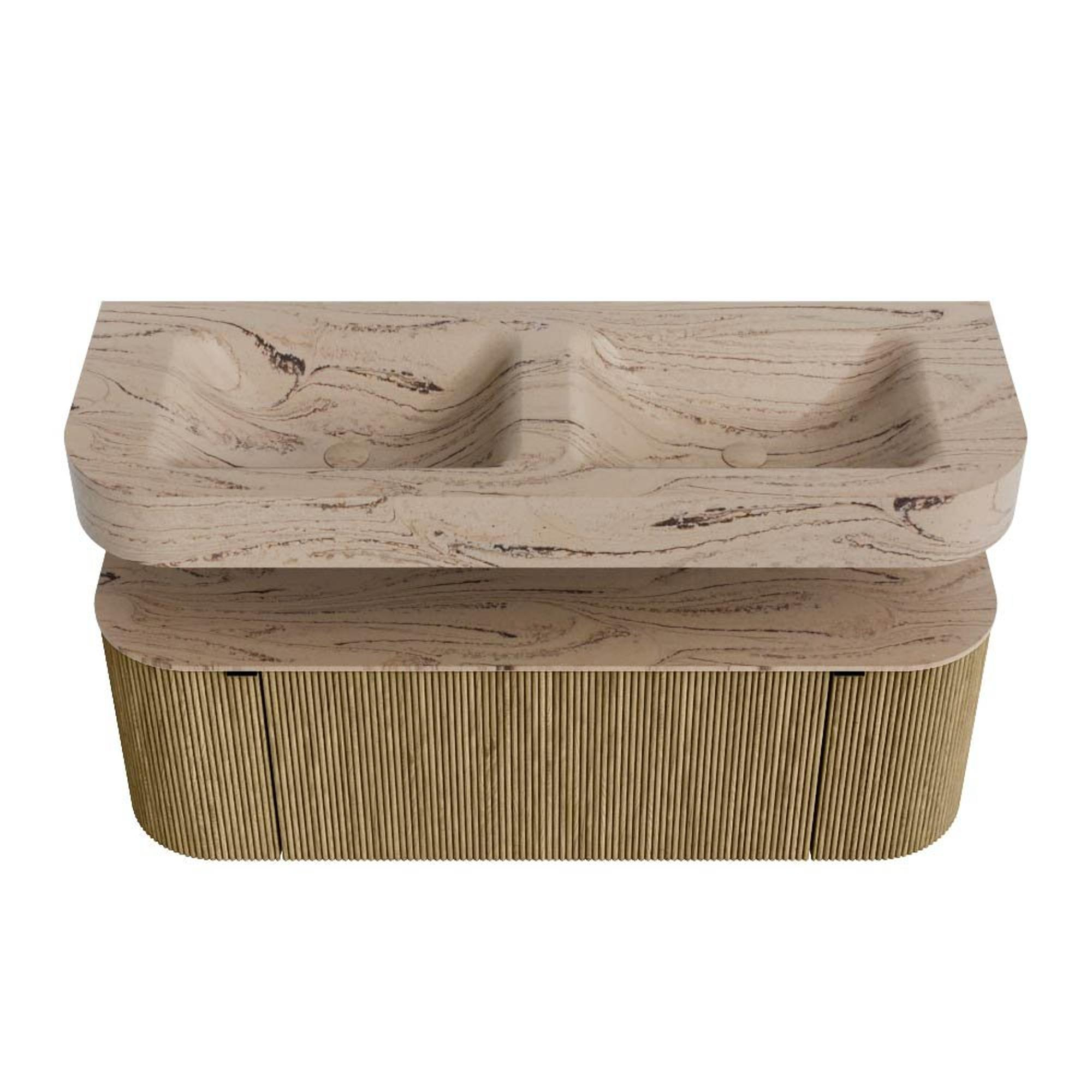 MONDIAZ THOR-DLUX 130cm badmeubel ronding links + rechts kleur Dusk met 1 lade en 2 deuren. Vrijhangende wastafel CLOUD Dubbel zonder kraangat kleur Arena.