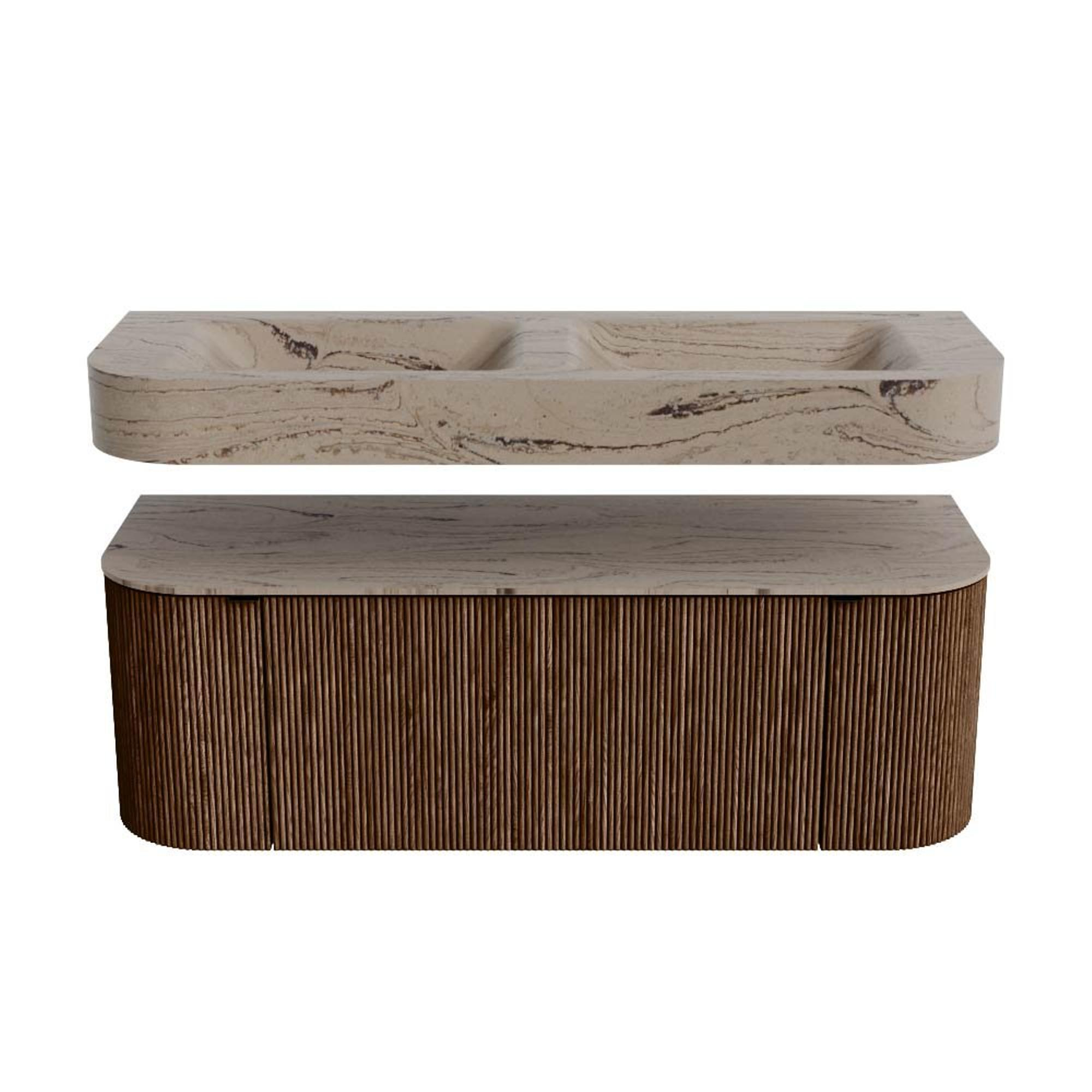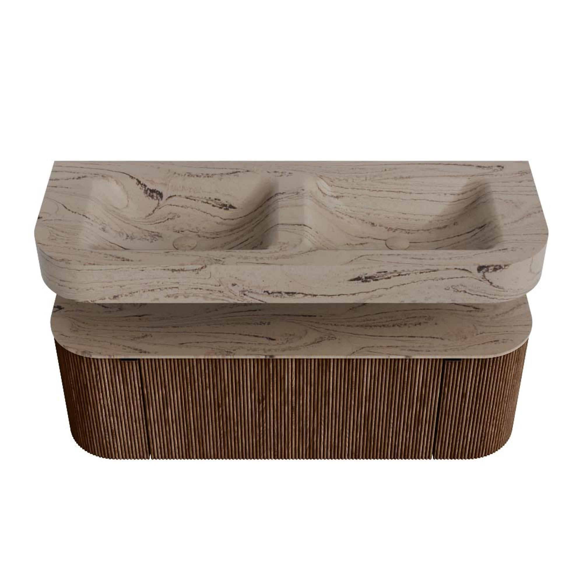MONDIAZ THOR-DLUX 130cm badmeubel ronding links + rechts kleur Walnut met 1 lade en 2 deuren. Vrijhangende wastafel CLOUD Dubbel zonder kraangat kleur Arena.