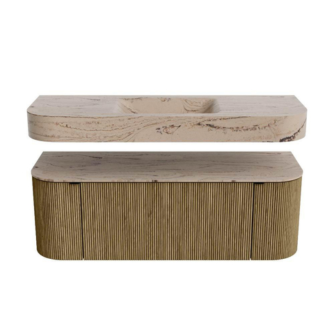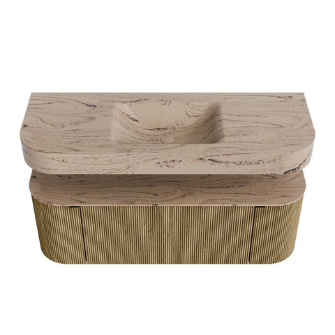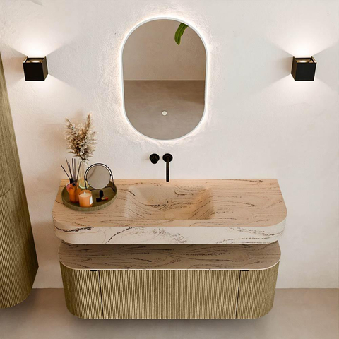 Natuurlijke materialen in warme tinten. De verticale ribbels brengen ritme en textuur in het ontwerp, terwijl het eikenhout zorgt voor een warme, ambachtelijke uitstraling. Kies uit 5 houttinten OAK, WALNUT, DUSK, SHADOW en RUBY zorgvuldig geselecteerde houtkleuren om zowel moderne als klassieke badkamers te verrijken.
