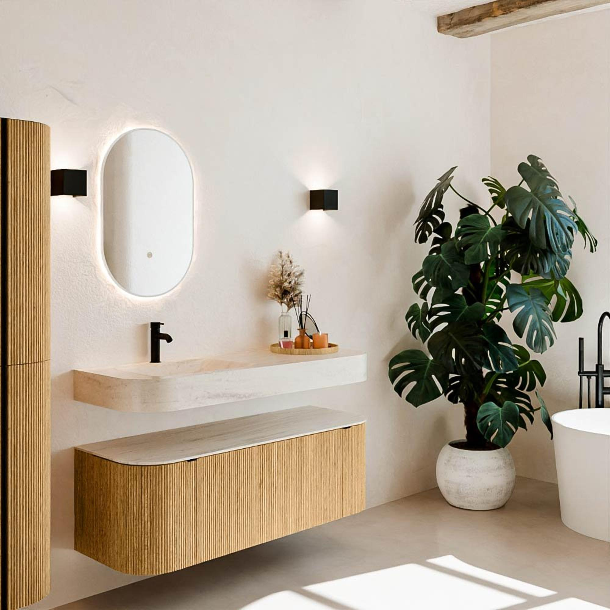 Natuurlijke materialen in warme tinten. De verticale ribbels brengen ritme en textuur in het ontwerp, terwijl het eikenhout zorgt voor een warme, ambachtelijke uitstraling. Kies uit 5 houttinten OAK, WALNUT, DUSK, SHADOW en RUBY zorgvuldig geselecteerde houtkleuren om zowel moderne als klassieke badkamers te verrijken.