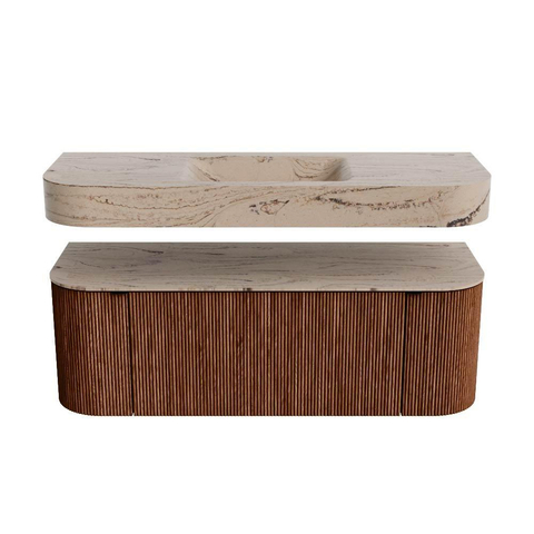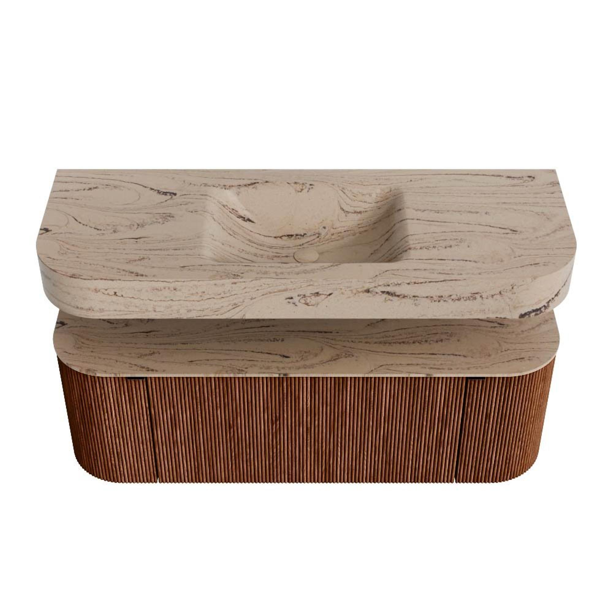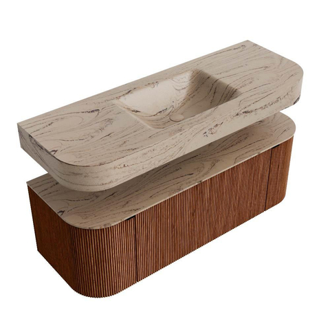 MONDIAZ THOR-DLUX 130cm badmeubel ronding links + rechts kleur Ruby met 1 lade en 2 deuren. Vrijhangende wastafel CLOUD Midden 1 kraangat kleur Arena.