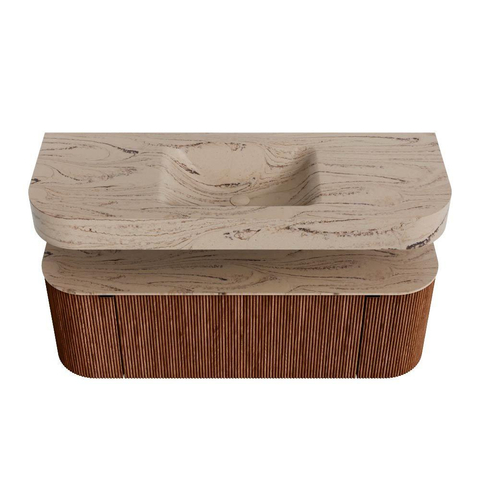 Natuurlijke materialen in warme tinten. De verticale ribbels brengen ritme en textuur in het ontwerp, terwijl het eikenhout zorgt voor een warme, ambachtelijke uitstraling. Kies uit 5 houttinten OAK, WALNUT, DUSK, SHADOW en RUBY zorgvuldig geselecteerde houtkleuren om zowel moderne als klassieke badkamers te verrijken.
