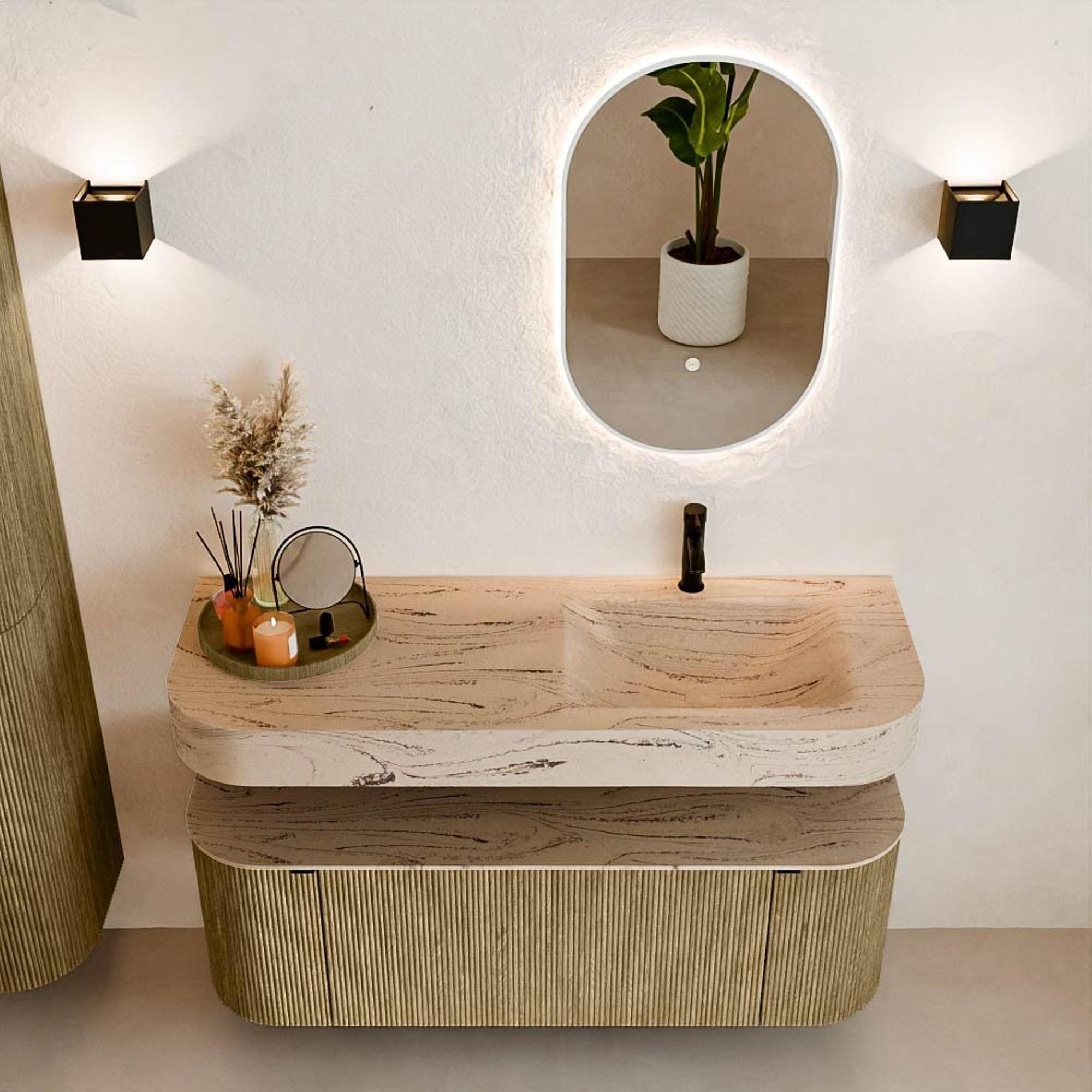 Natuurlijke materialen in warme tinten. De verticale ribbels brengen ritme en textuur in het ontwerp, terwijl het eikenhout zorgt voor een warme, ambachtelijke uitstraling. Kies uit 5 houttinten OAK, WALNUT, DUSK, SHADOW en RUBY zorgvuldig geselecteerde houtkleuren om zowel moderne als klassieke badkamers te verrijken.