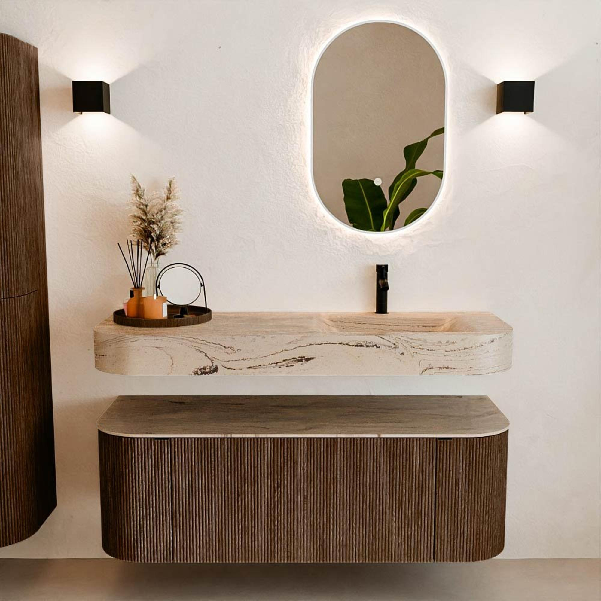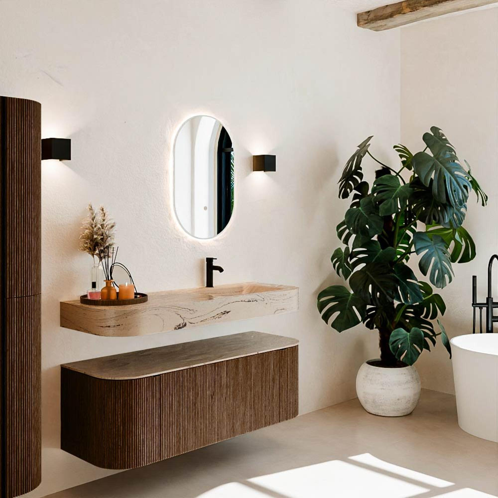 Natuurlijke materialen in warme tinten. De verticale ribbels brengen ritme en textuur in het ontwerp, terwijl het eikenhout zorgt voor een warme, ambachtelijke uitstraling. Kies uit 5 houttinten OAK, WALNUT, DUSK, SHADOW en RUBY zorgvuldig geselecteerde houtkleuren om zowel moderne als klassieke badkamers te verrijken.