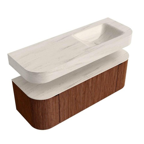 MONDIAZ THOR-DLUX 130cm badmeubel ronding links + rechts kleur Ruby met 1 lade en 2 deuren. Vrijhangende wastafel CLOUD Rechts zonder kraangat kleur Meli.
