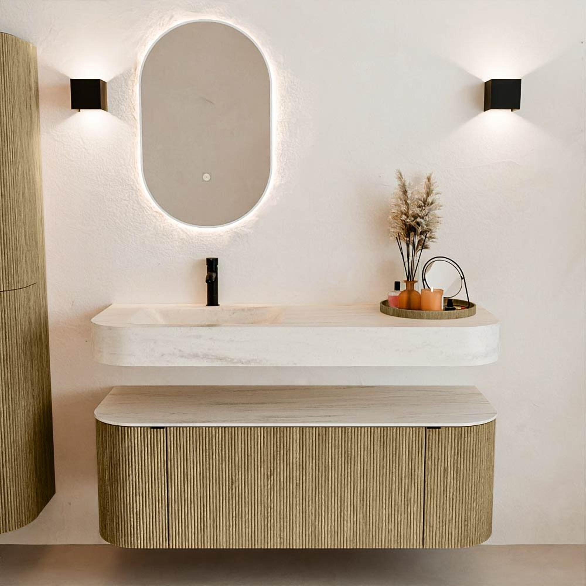 Natuurlijke materialen in warme tinten. De verticale ribbels brengen ritme en textuur in het ontwerp, terwijl het eikenhout zorgt voor een warme, ambachtelijke uitstraling. Kies uit 5 houttinten OAK, WALNUT, DUSK, SHADOW en RUBY zorgvuldig geselecteerde houtkleuren om zowel moderne als klassieke badkamers te verrijken.
