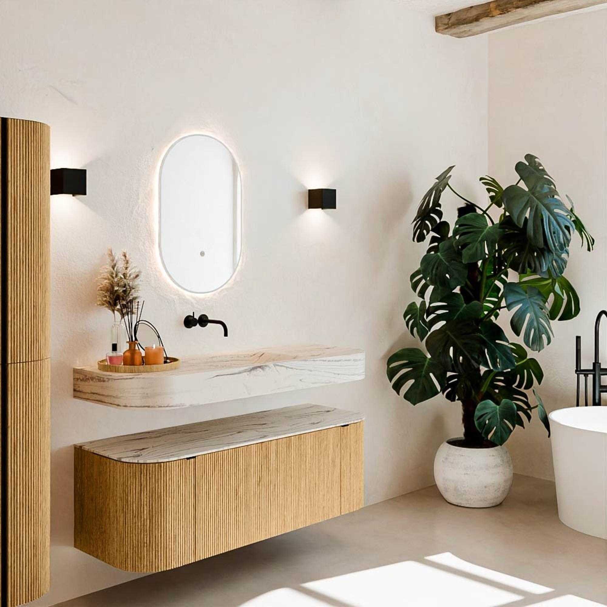Natuurlijke materialen in warme tinten. De verticale ribbels brengen ritme en textuur in het ontwerp, terwijl het eikenhout zorgt voor een warme, ambachtelijke uitstraling. Kies uit 5 houttinten OAK, WALNUT, DUSK, SHADOW en RUBY zorgvuldig geselecteerde houtkleuren om zowel moderne als klassieke badkamers te verrijken.
