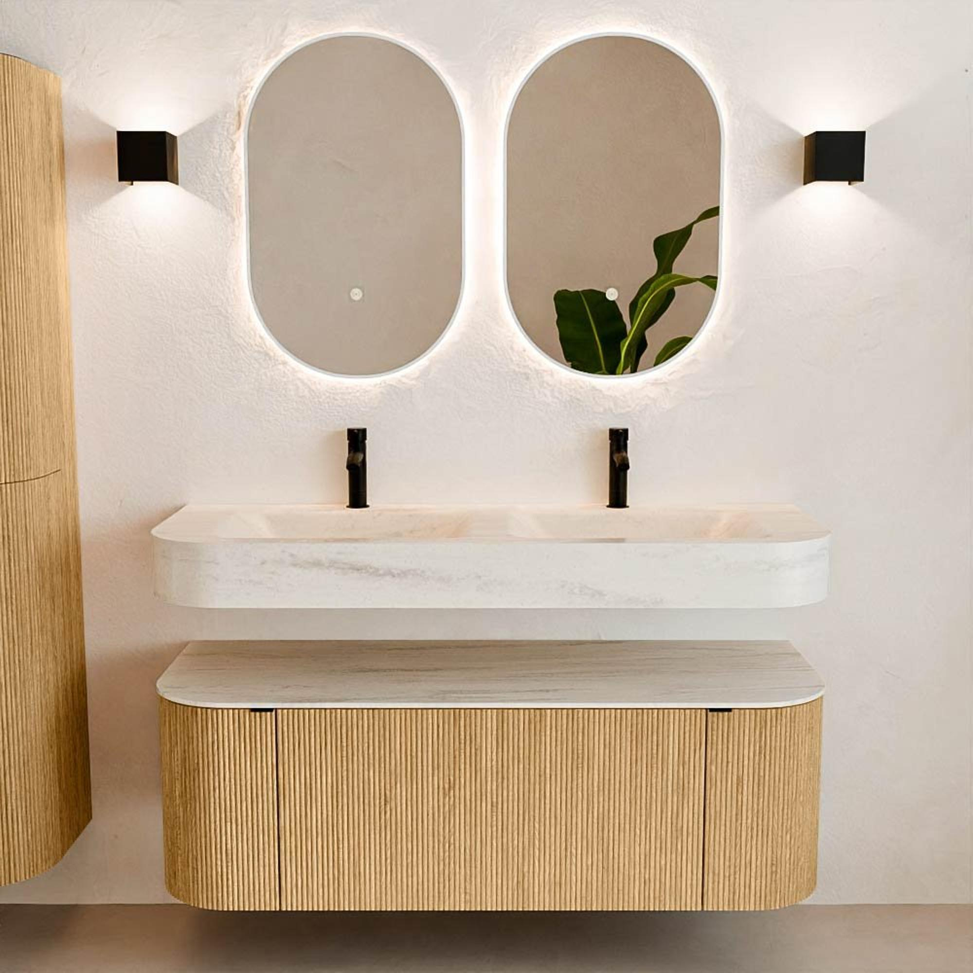Natuurlijke materialen in warme tinten. De verticale ribbels brengen ritme en textuur in het ontwerp, terwijl het eikenhout zorgt voor een warme, ambachtelijke uitstraling. Kies uit 5 houttinten OAK, WALNUT, DUSK, SHADOW en RUBY zorgvuldig geselecteerde houtkleuren om zowel moderne als klassieke badkamers te verrijken.
