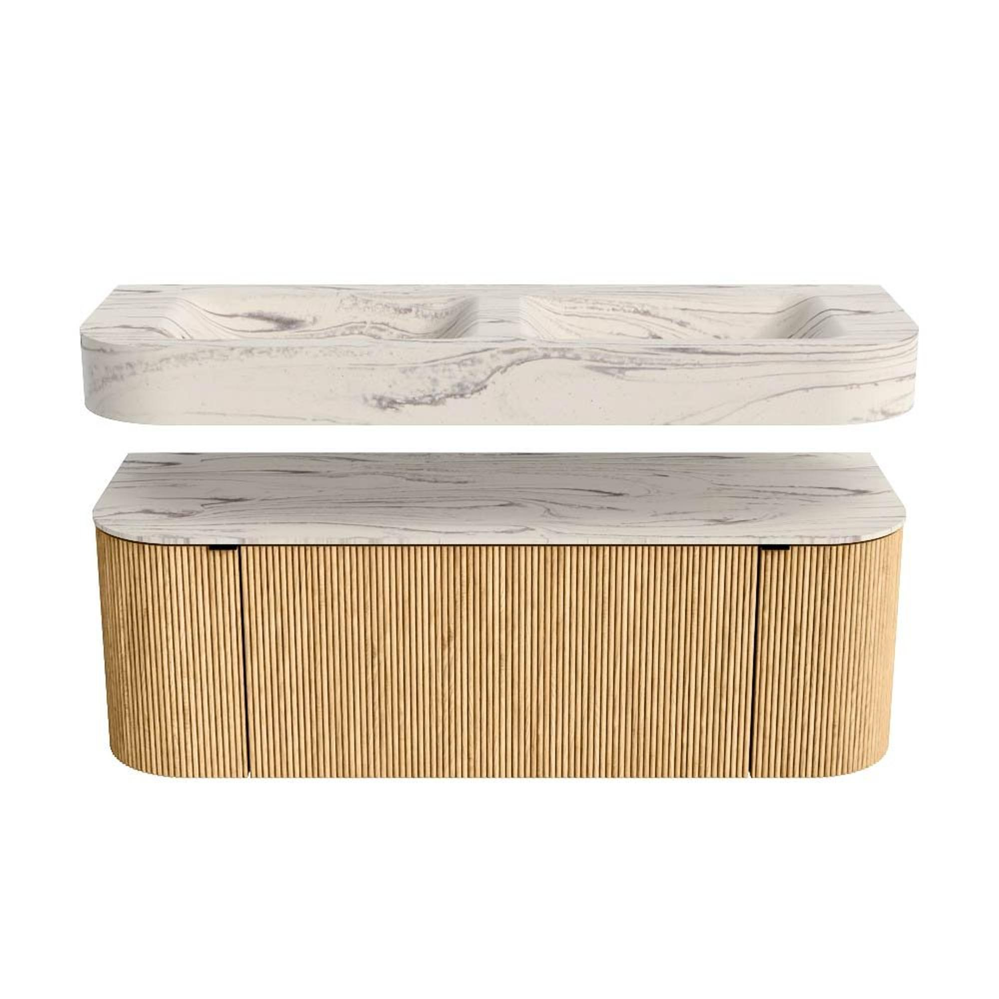 Boven het meubel zweeft een bijpassende, vrij hangende wastafel met afgeronde hoeken – perfect afgestemd op de vorm van de kast. De wastafel is uitgevoerd in Solid Surface en volgt subtiel de lijnen van het onderliggende meubel, waardoor een harmonieus geheel ontstaat. Het Solid Surface topblad vormt een sterke, onderhoudsvriendelijke basis en maakt de combinatie compleet.