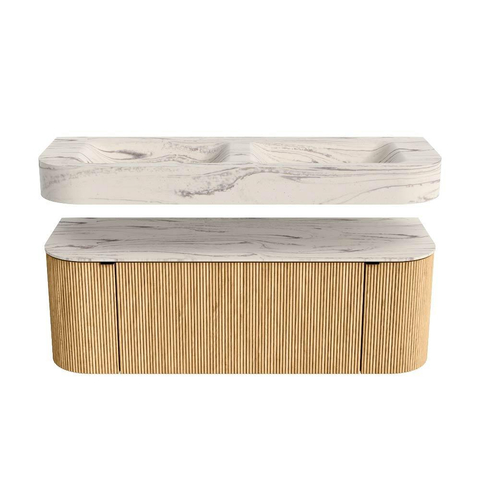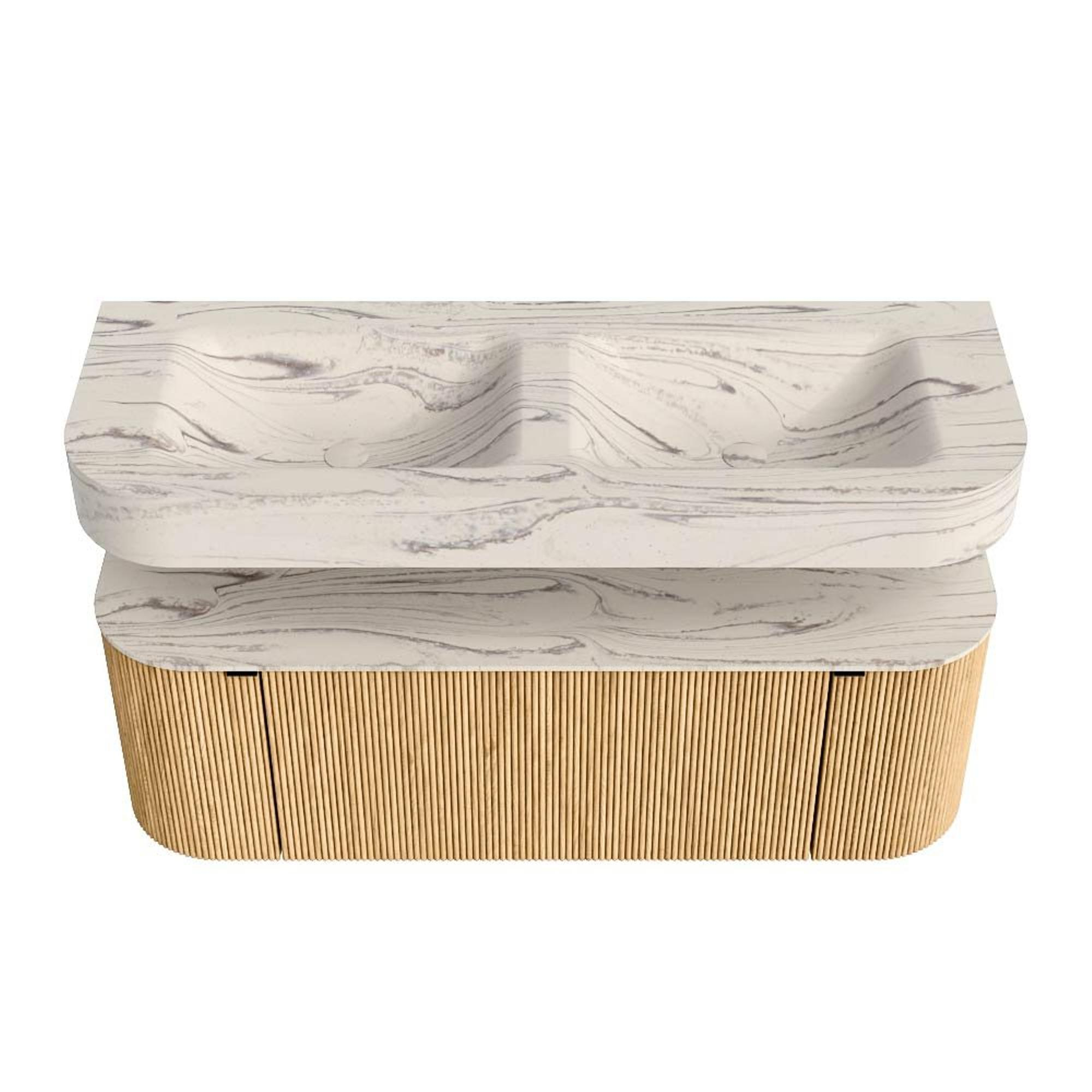 MONDIAZ THOR-DLUX 130cm badmeubel ronding links + rechts kleur Oak met 1 lade en 2 deuren. Vrijhangende wastafel CLOUD Dubbel 2 kraangaten kleur Nata.